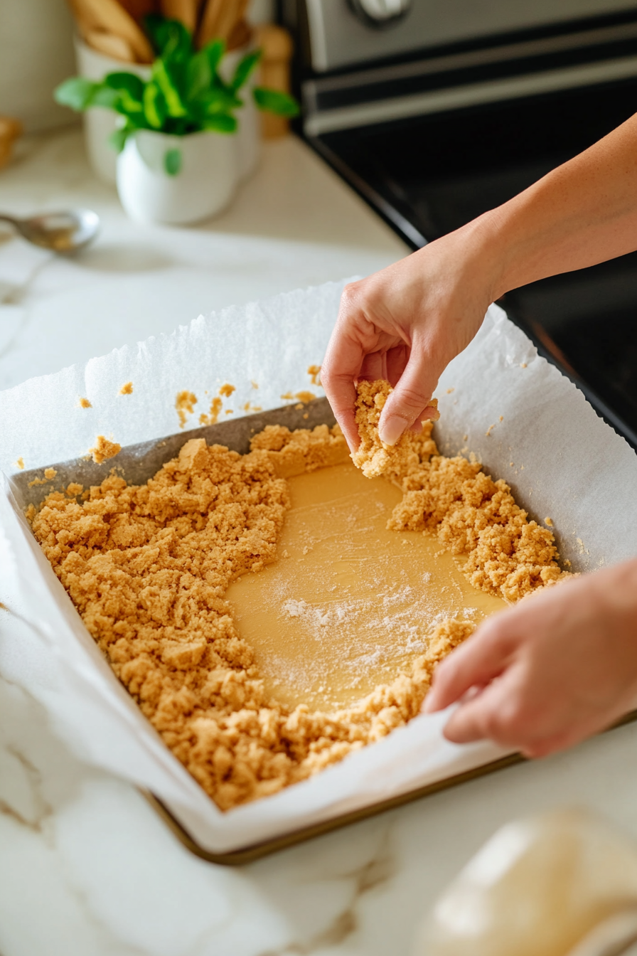 Press the crust mixture evenly into the lined pan and bake for 10 minutes. Set aside to cool for 10 minutes.