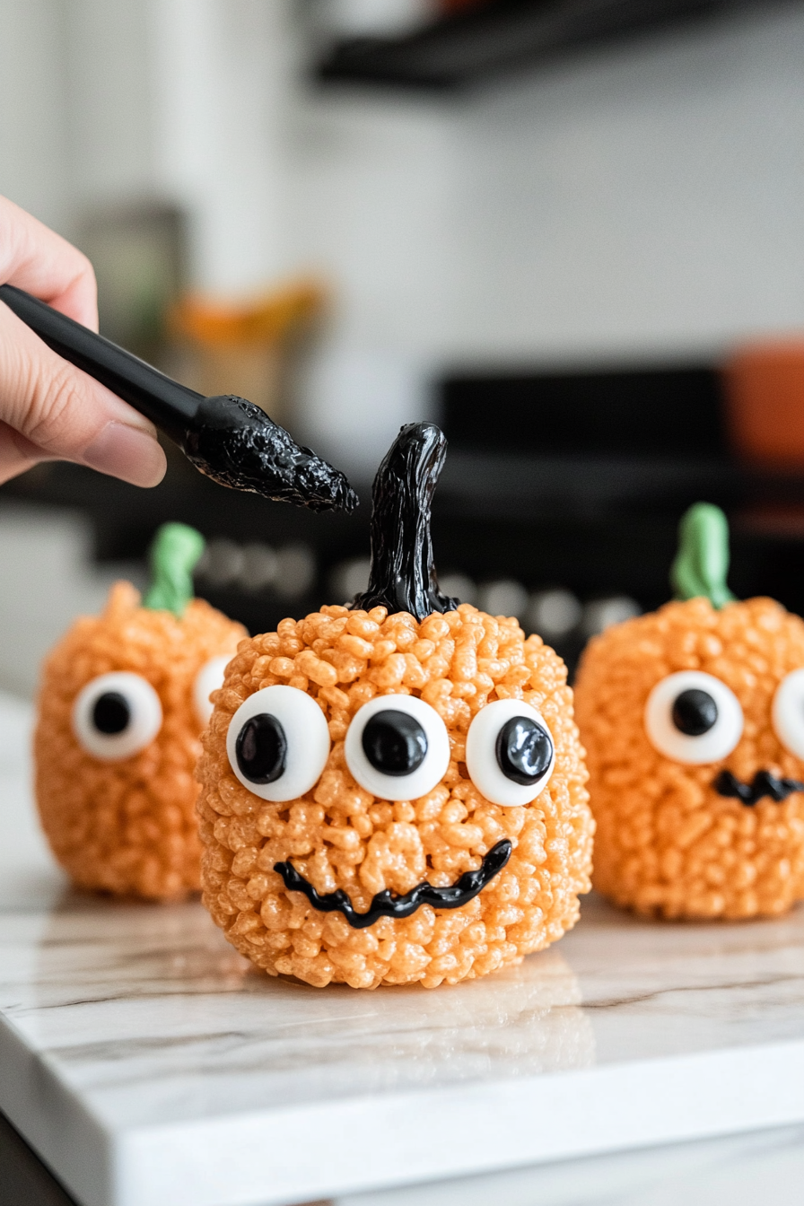 Dot black cookie icing on the candy eyeballs, sticking them to the pumpkins, and use icing to add a unique face.