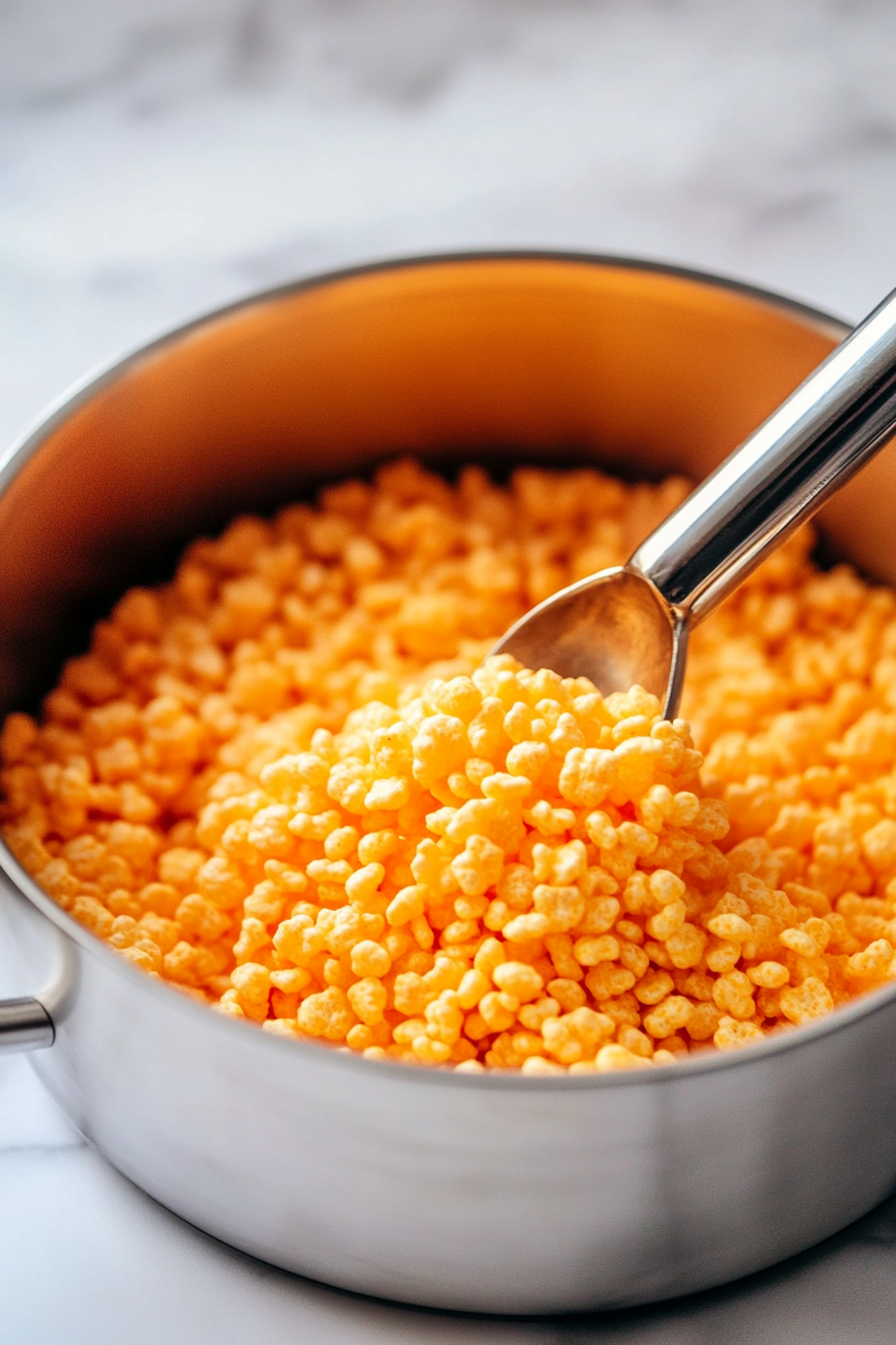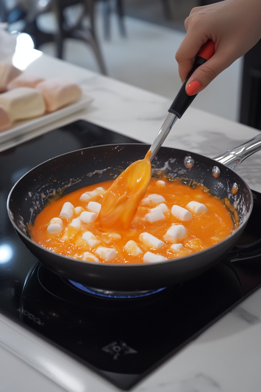 Add red and yellow food coloring to the melted marshmallow mixture, using about 10 drops of red and 40 drops of yellow for a bright orange color.