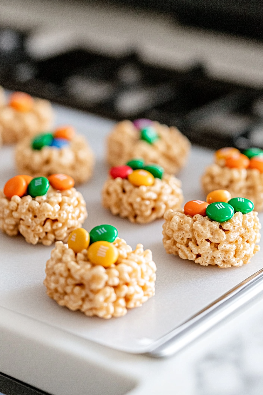 Push a mini Kit Kat into the top of each ball as the “stem” and press a green M&M beside it for a “leaf.” (It’s easier to add the M&M once the treats firm up slightly.)