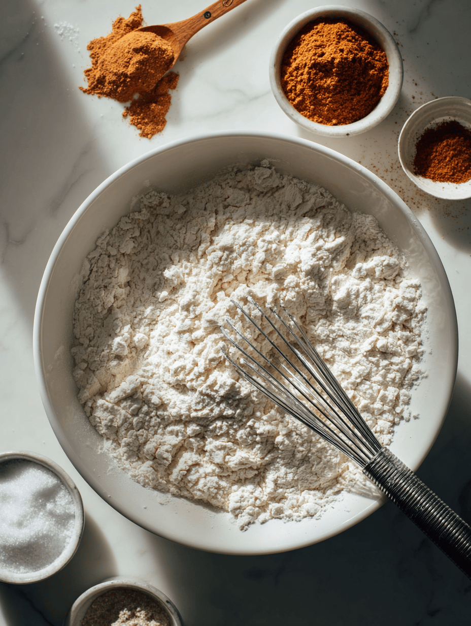 In a large bowl, whisk together the flour, baking powder, sugar, salt, and pumpkin spice until well combined. This creates a fluffy, uniform dry mixture.