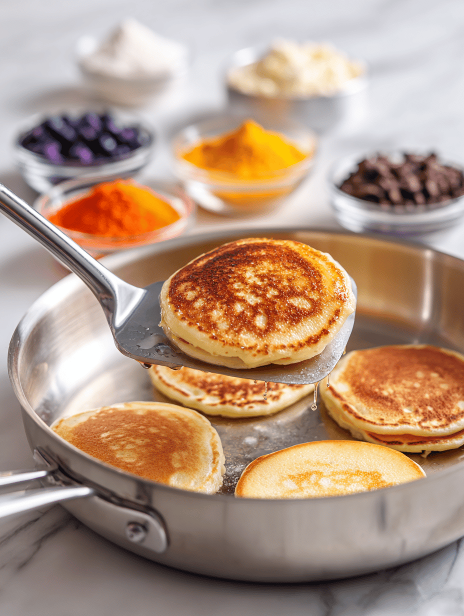 Carefully flip each pancake with a spatula and cook for an additional 1-2 minutes until golden brown on both sides. The pancakes should feel firm yet tender when gently pressed.