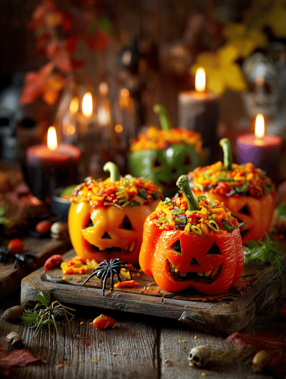 Serve the Halloween stuffed peppers hot, with the smoky aroma inviting everyone to dig in and enjoy the flavorful, festive dish.
