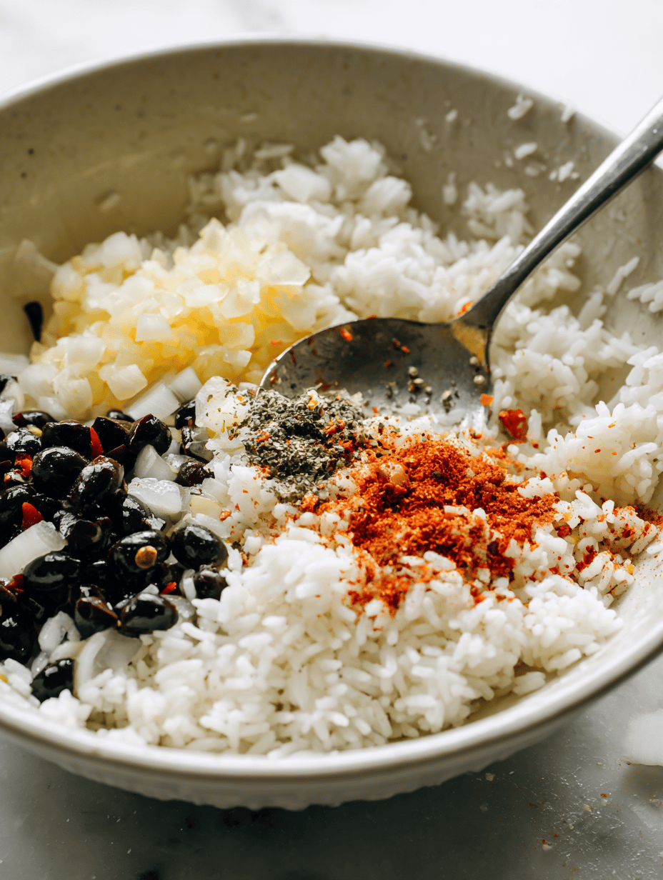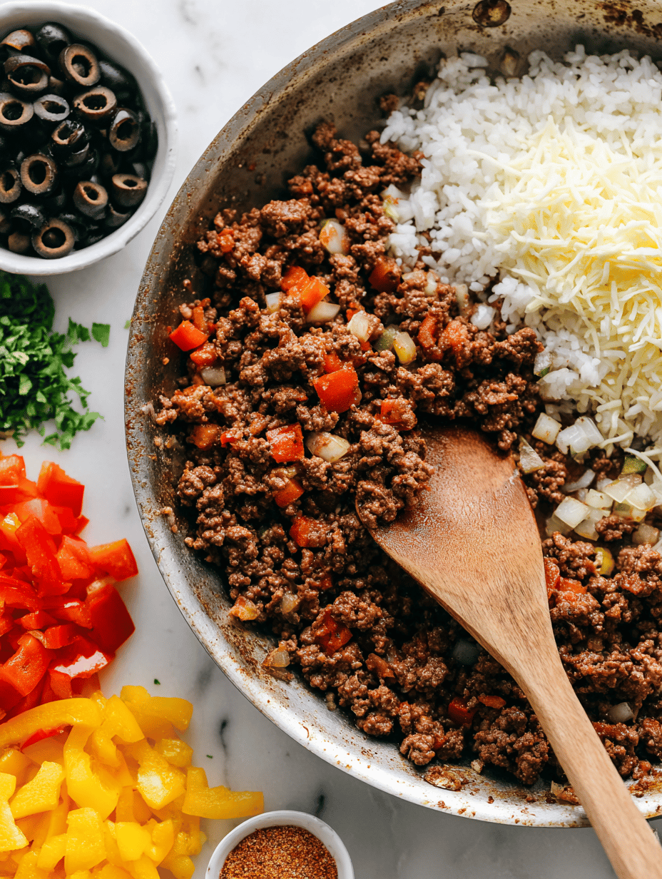 Stir in the cooked rice, chopped black olives, smoked paprika, salt, and pepper. Mix thoroughly until all ingredients are combined and heated through, about 2 minutes, letting the flavors meld.
