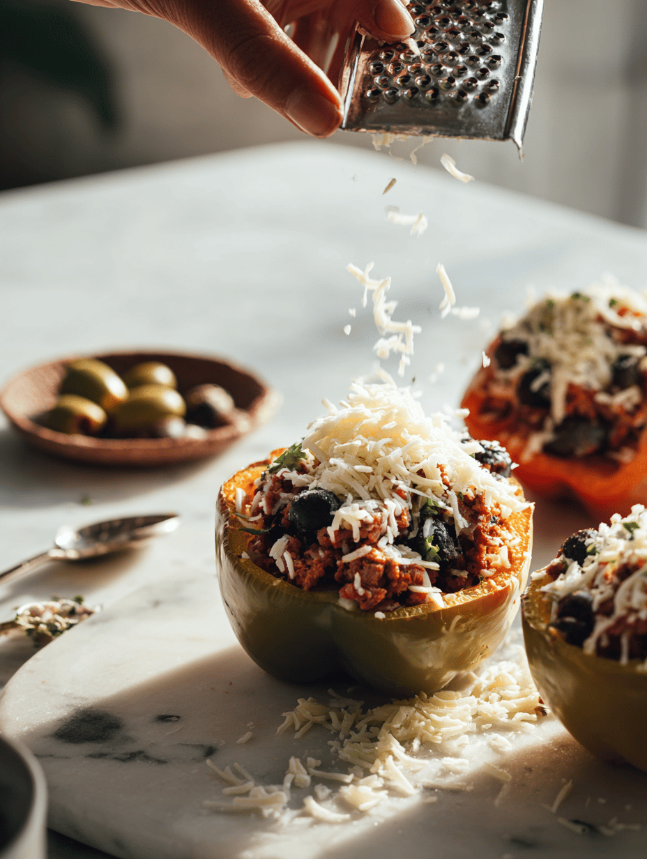 Sprinkle shredded cheese generously over the top of each stuffed pepper for that gooey, golden finish.