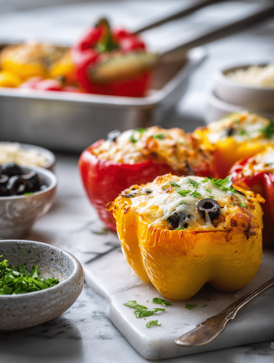 Using a spoon, stuff each pepper with the savory filling, pressing down gently to pack it in. Place the stuffed peppers upright in a baking dish.