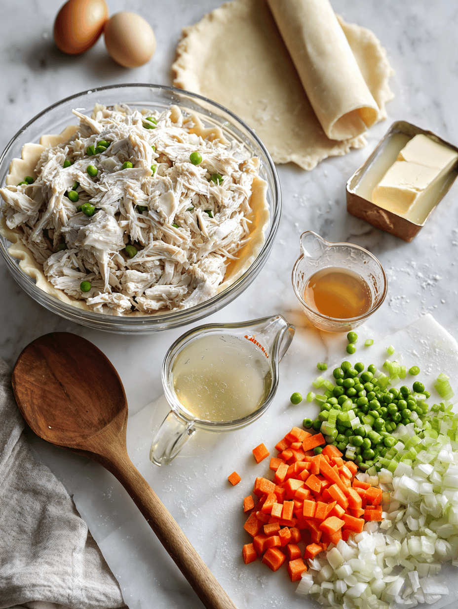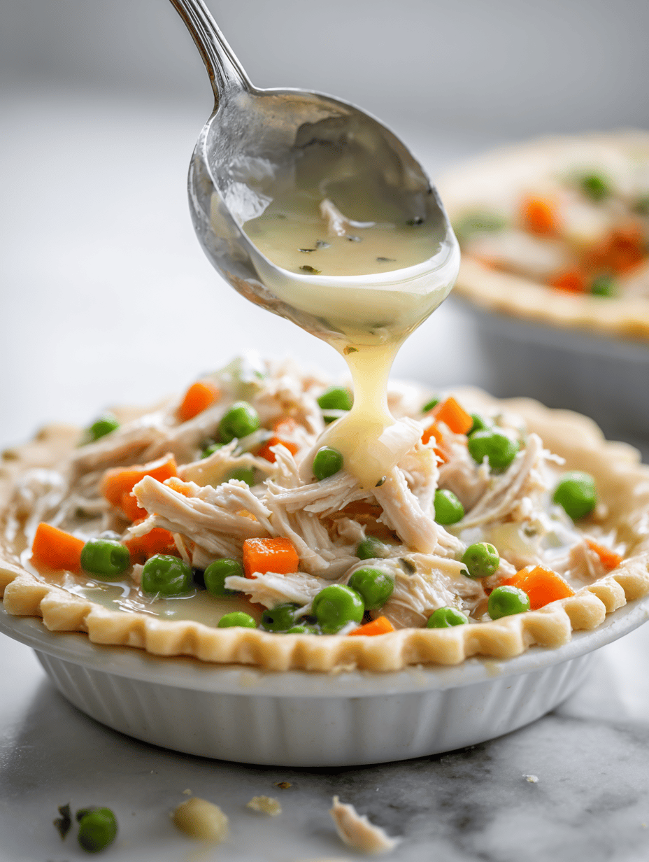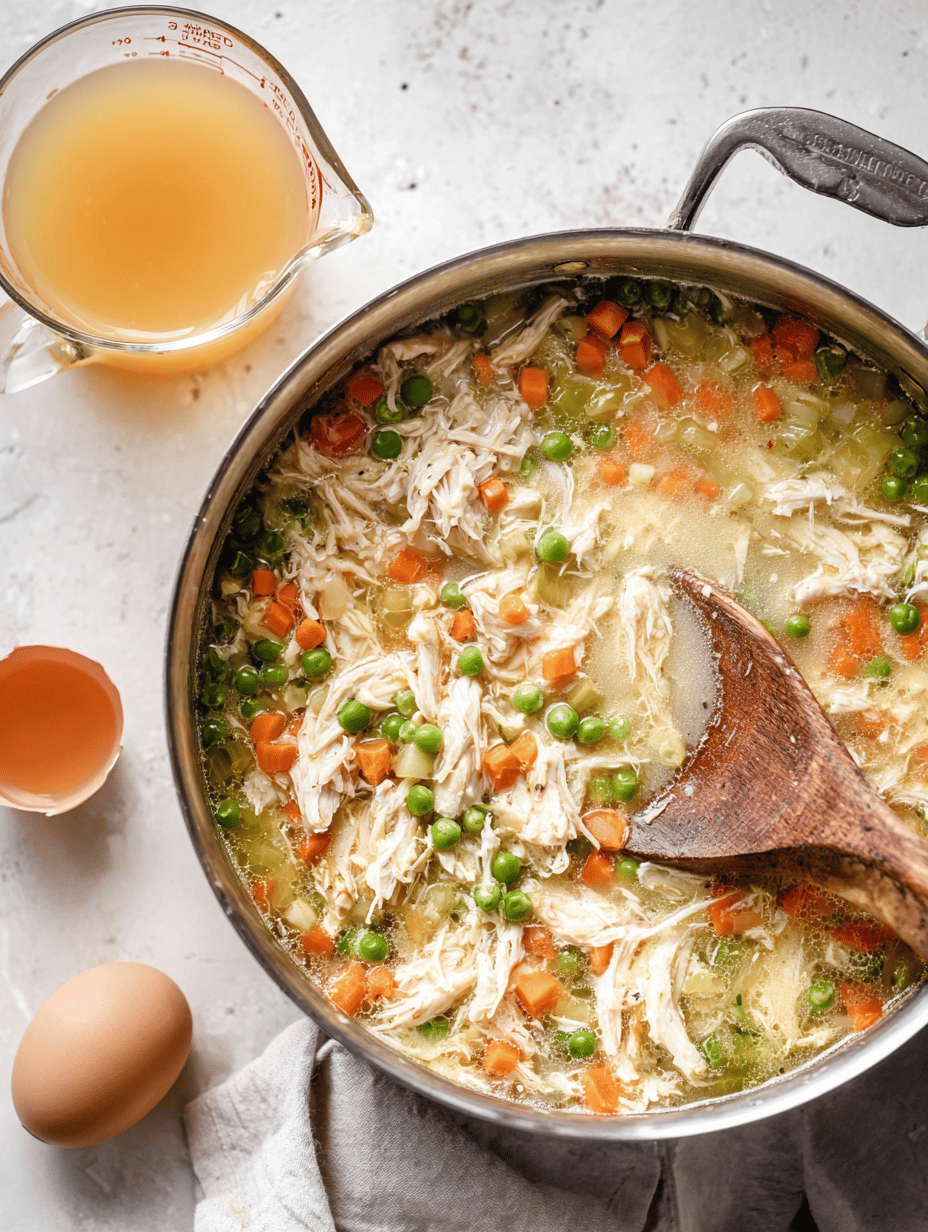 Stir in shredded chicken and pour in the chicken broth. Let everything simmer gently until the mixture thickens slightly and the vegetables are fully cooked, about 10 minutes. You’ll see it bubbling and the filling becoming creamy.