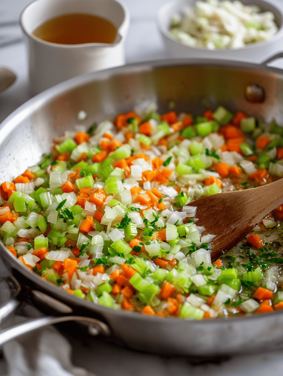 Add chopped onions, carrots, and celery to the skillet. Cook, stirring occasionally, until the vegetables soften and become fragrant, about 8 minutes. They should look slightly translucent and tender.