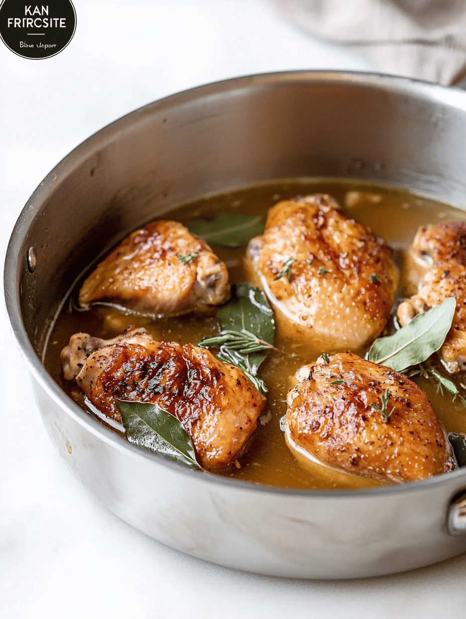 Return the browned chicken to the pot, arranging it in a single layer. Pour in the warm chicken broth, ensuring the chicken is mostly covered. Add the bay leaves and thyme for aromatic flavor.