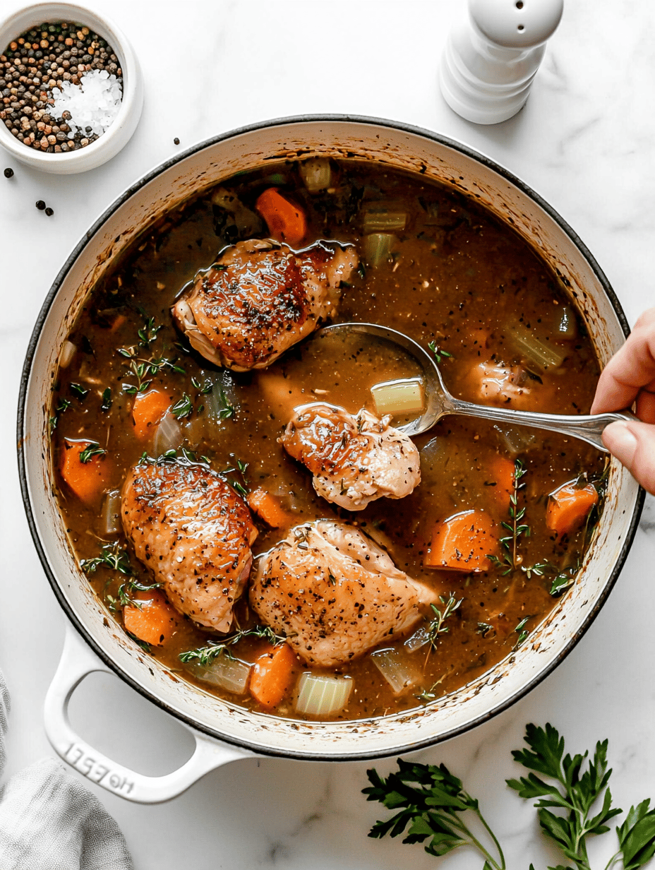 Bring the mixture to a gentle simmer, then cover the pot and reduce the heat to low. Let the chicken braise gently for about 40 minutes, or until the meat is tender and falling off the bone.