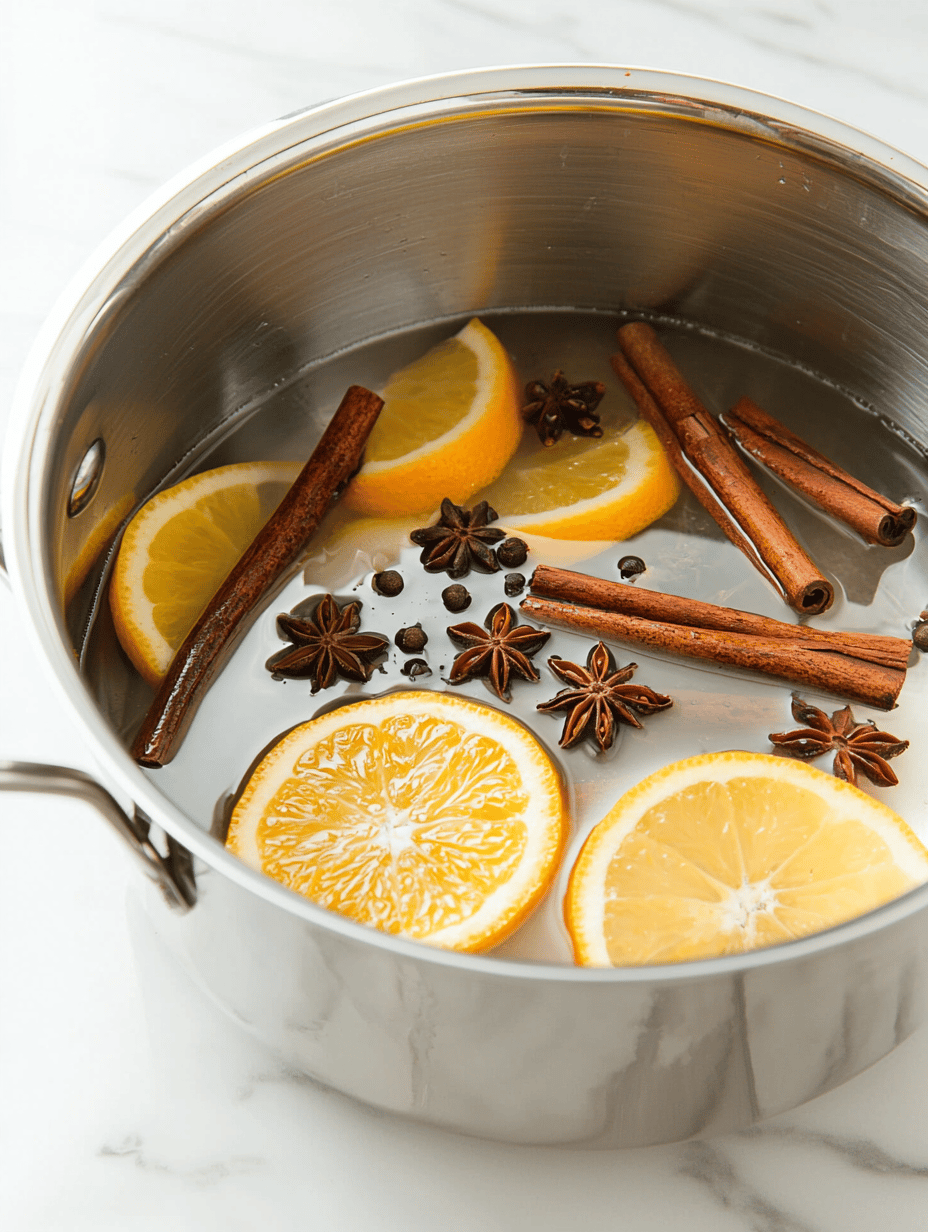 Pour water into a large saucepan and add the cinnamon sticks, cloves, star anise (if using), and a few slices of orange and lemon. Turn on the heat over medium-high and bring to a gentle simmer, filling your kitchen with fragrant steam.