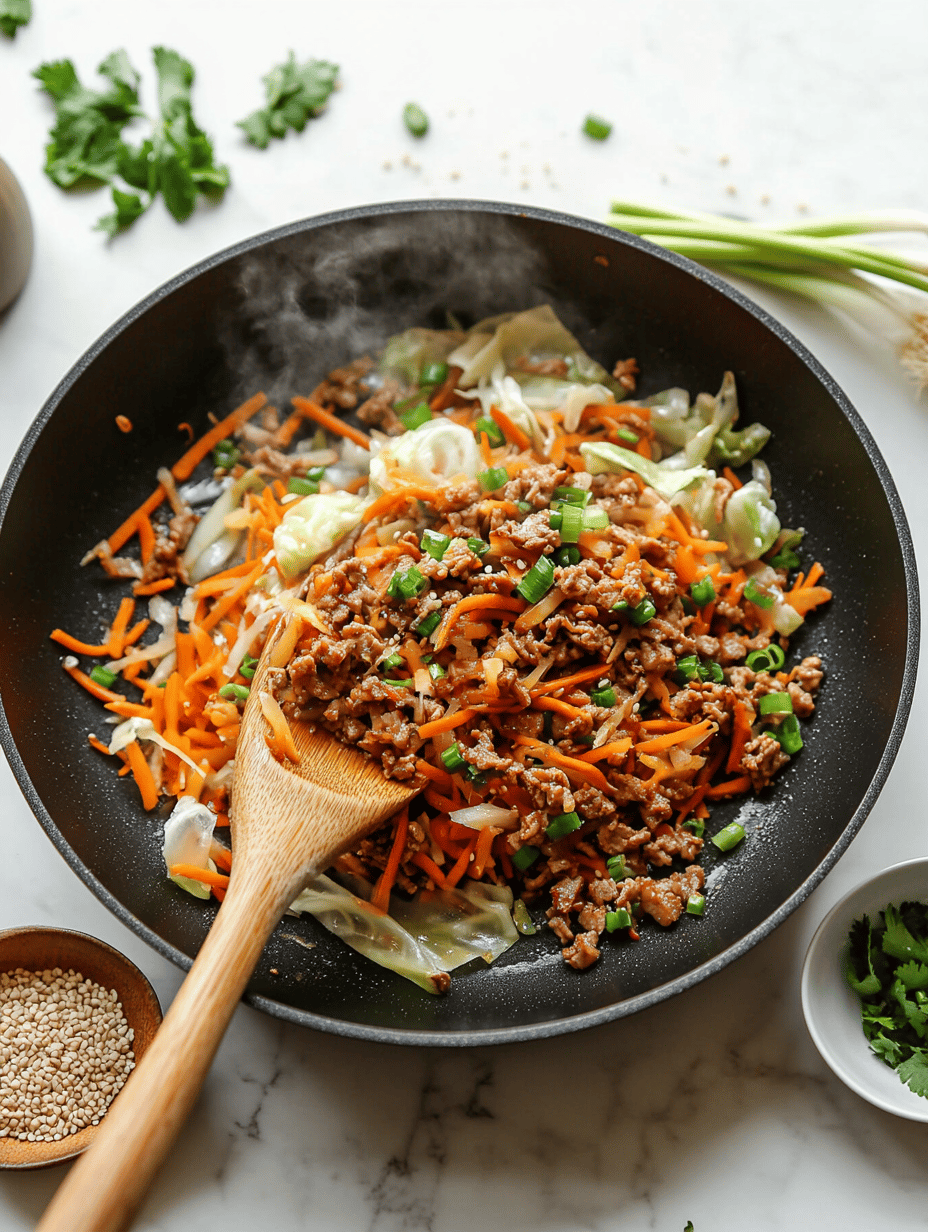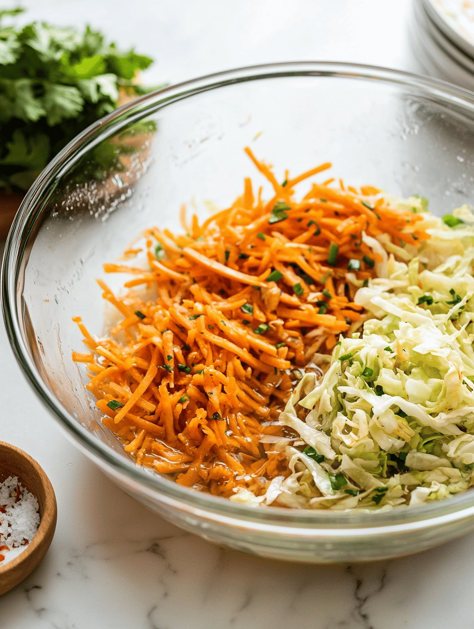 In a mixing bowl, combine the ground pork, chopped cabbage, and minced garlic. Season with salt and pepper.