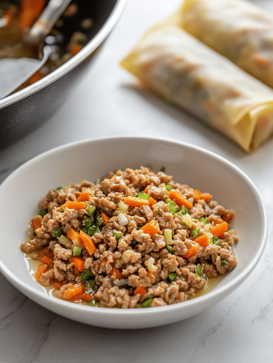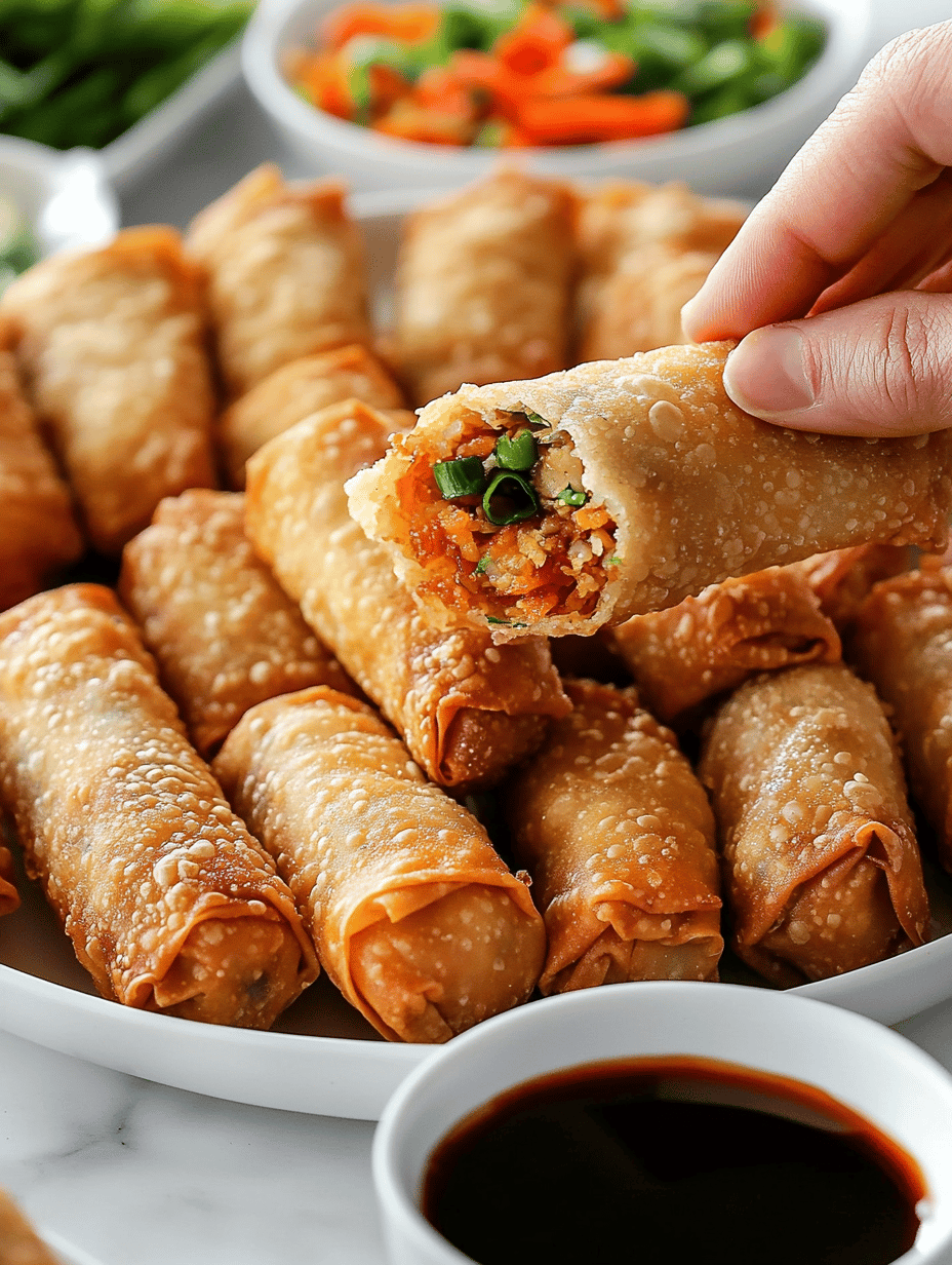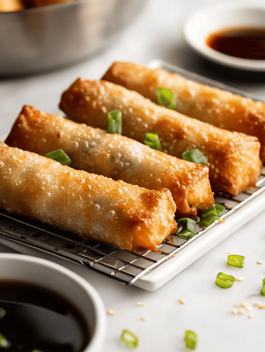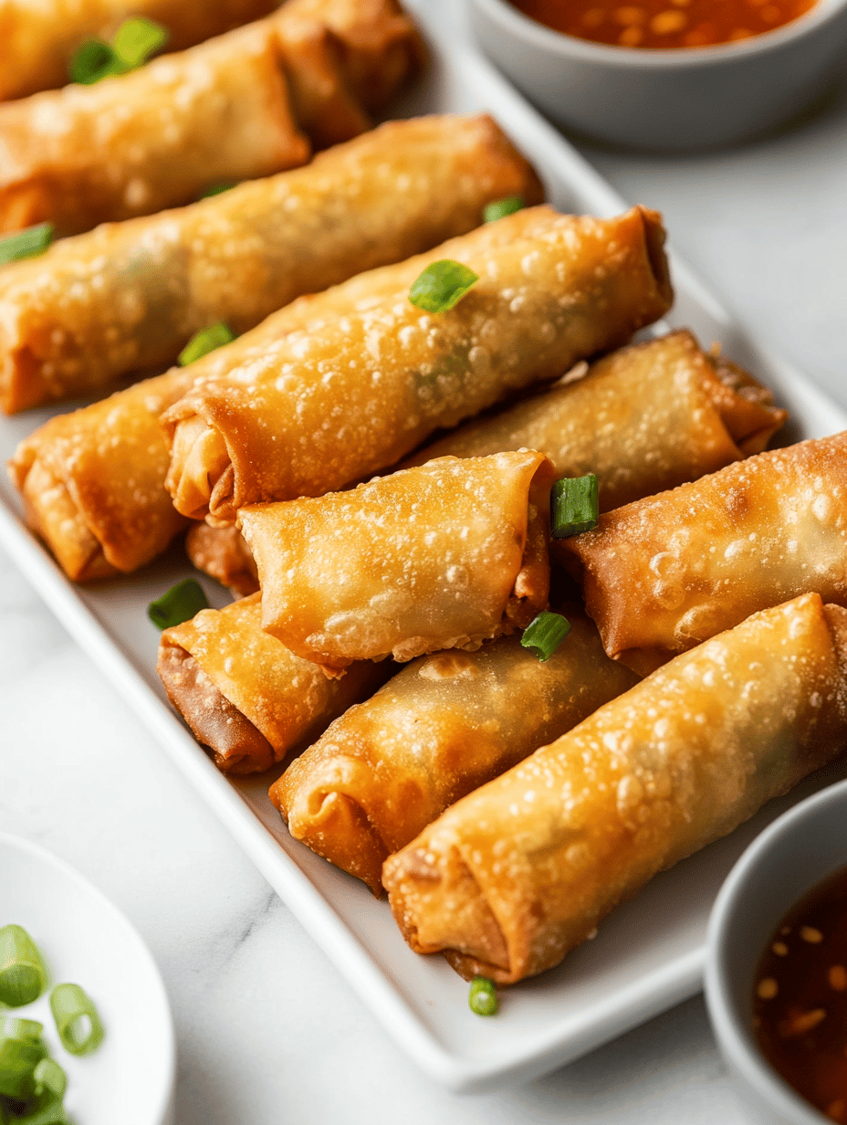 Crispy homemade egg rolls filled with savory pork and cabbage or your choice of vegetables, served with a dipping sauce.