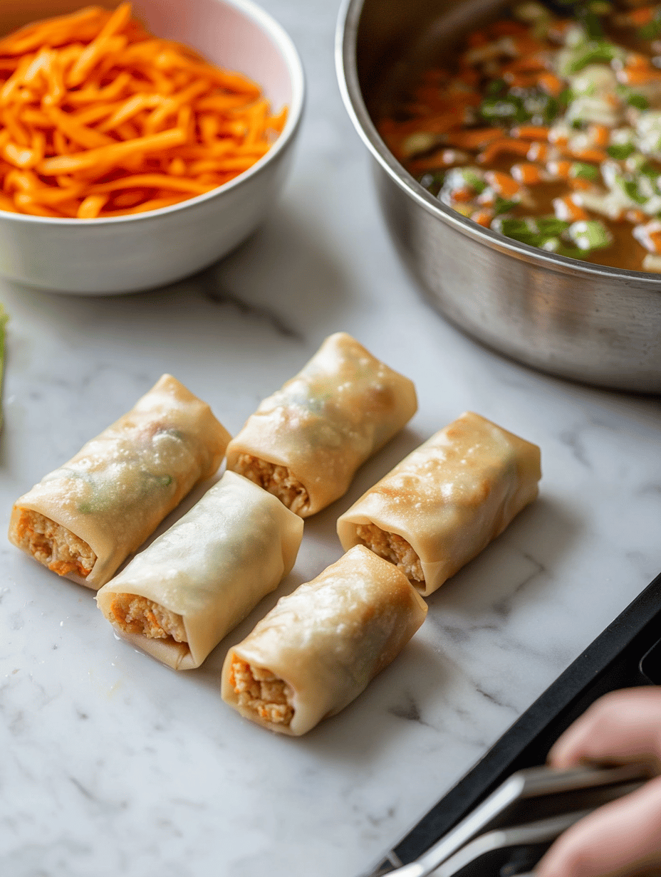 Plate the egg rolls and serve warm with your choice of dipping sauce.