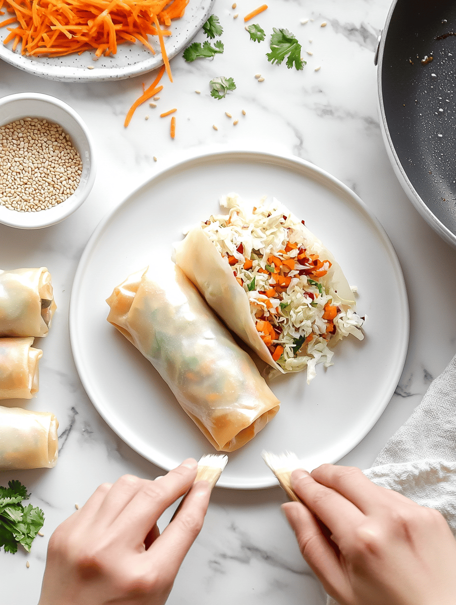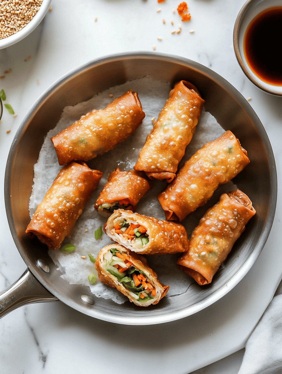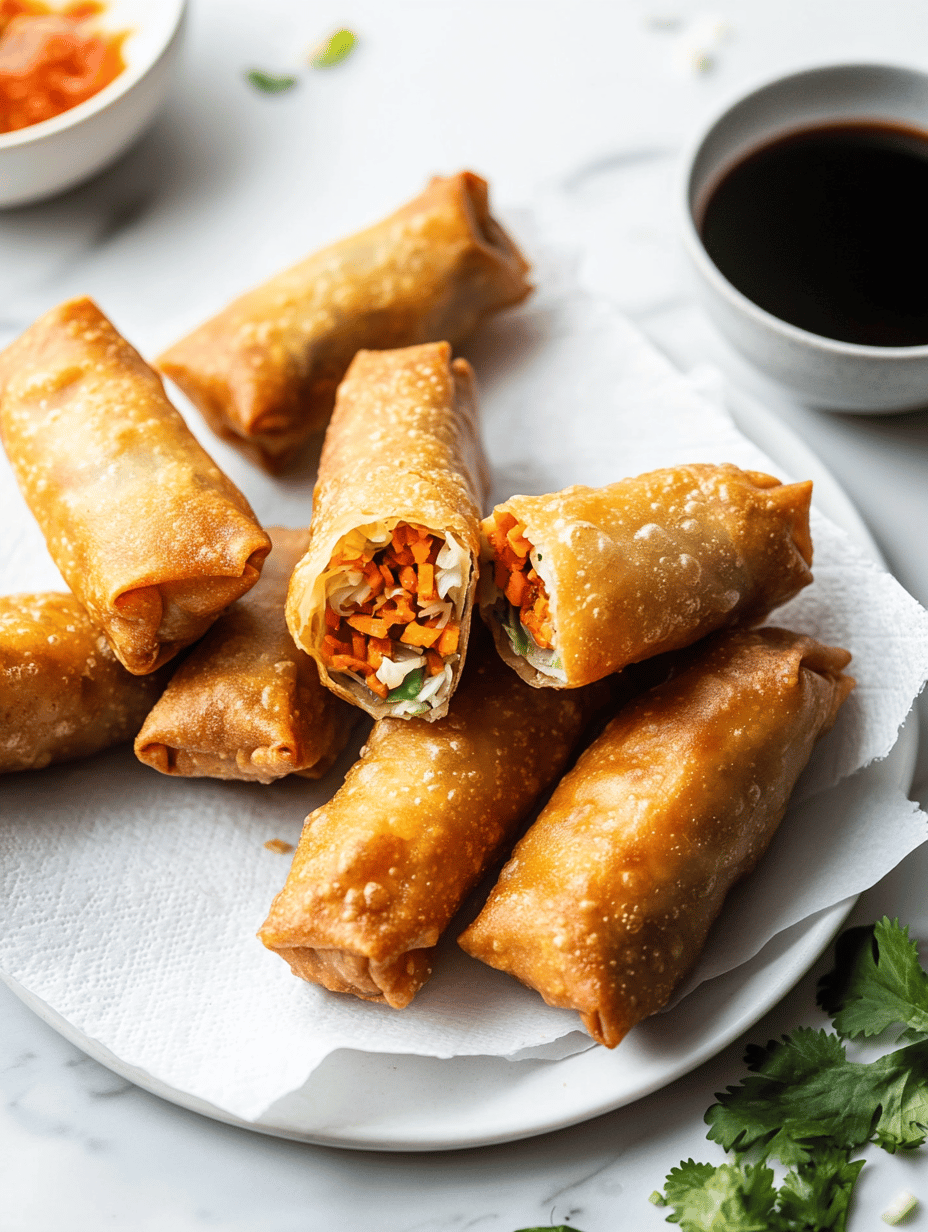 Deliciously crispy egg rolls filled with a savory mix of vegetables and flavors, served with a homemade sweet chili sauce.