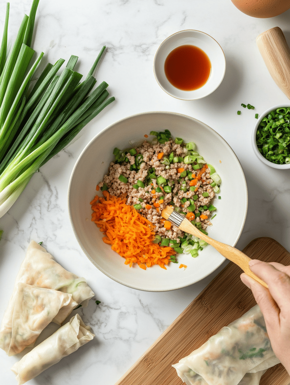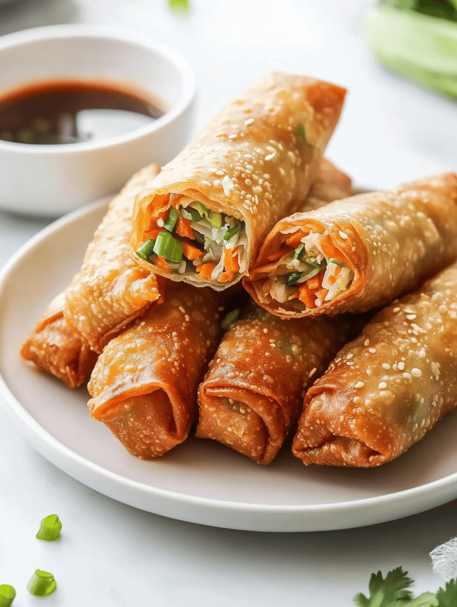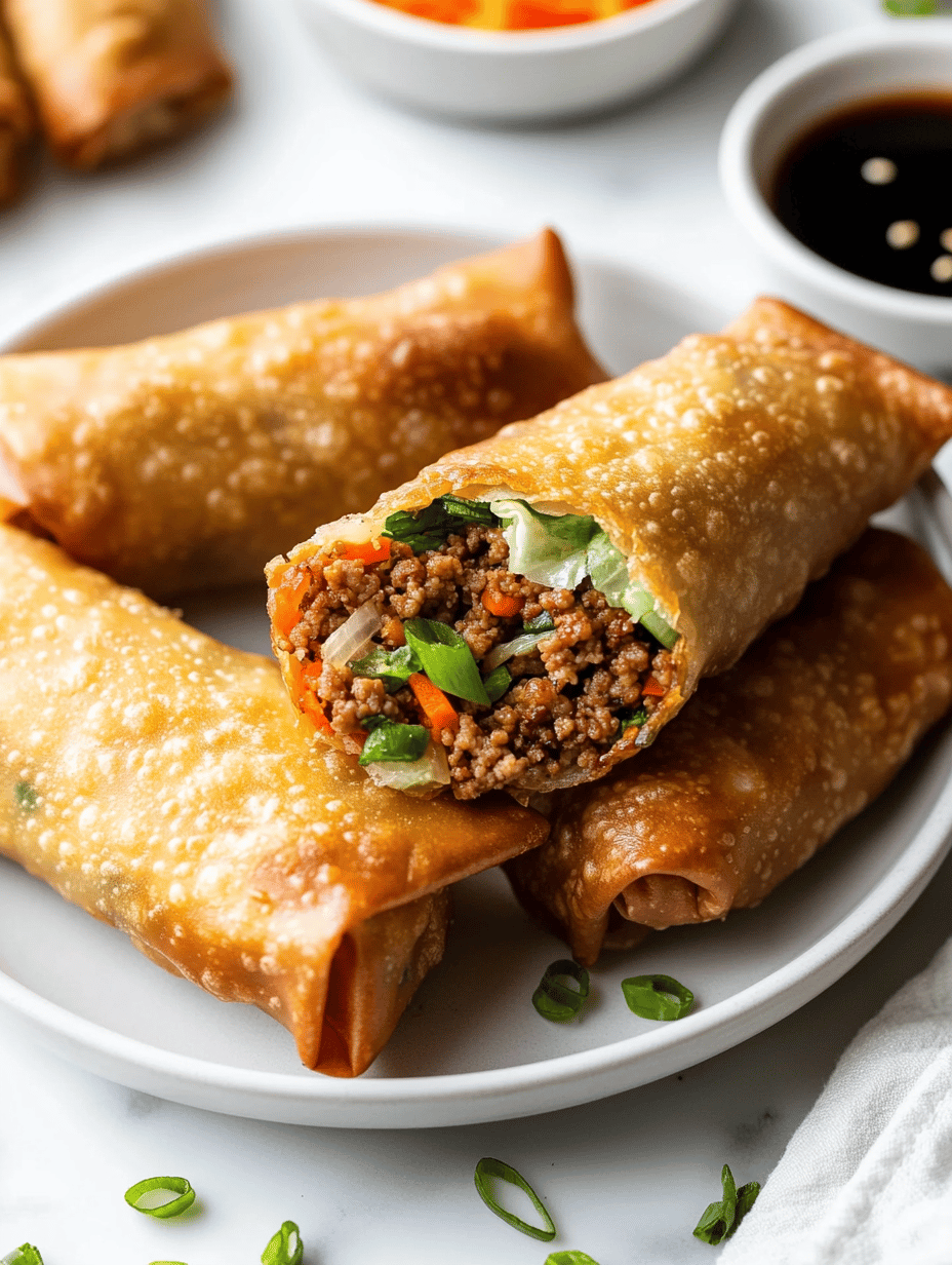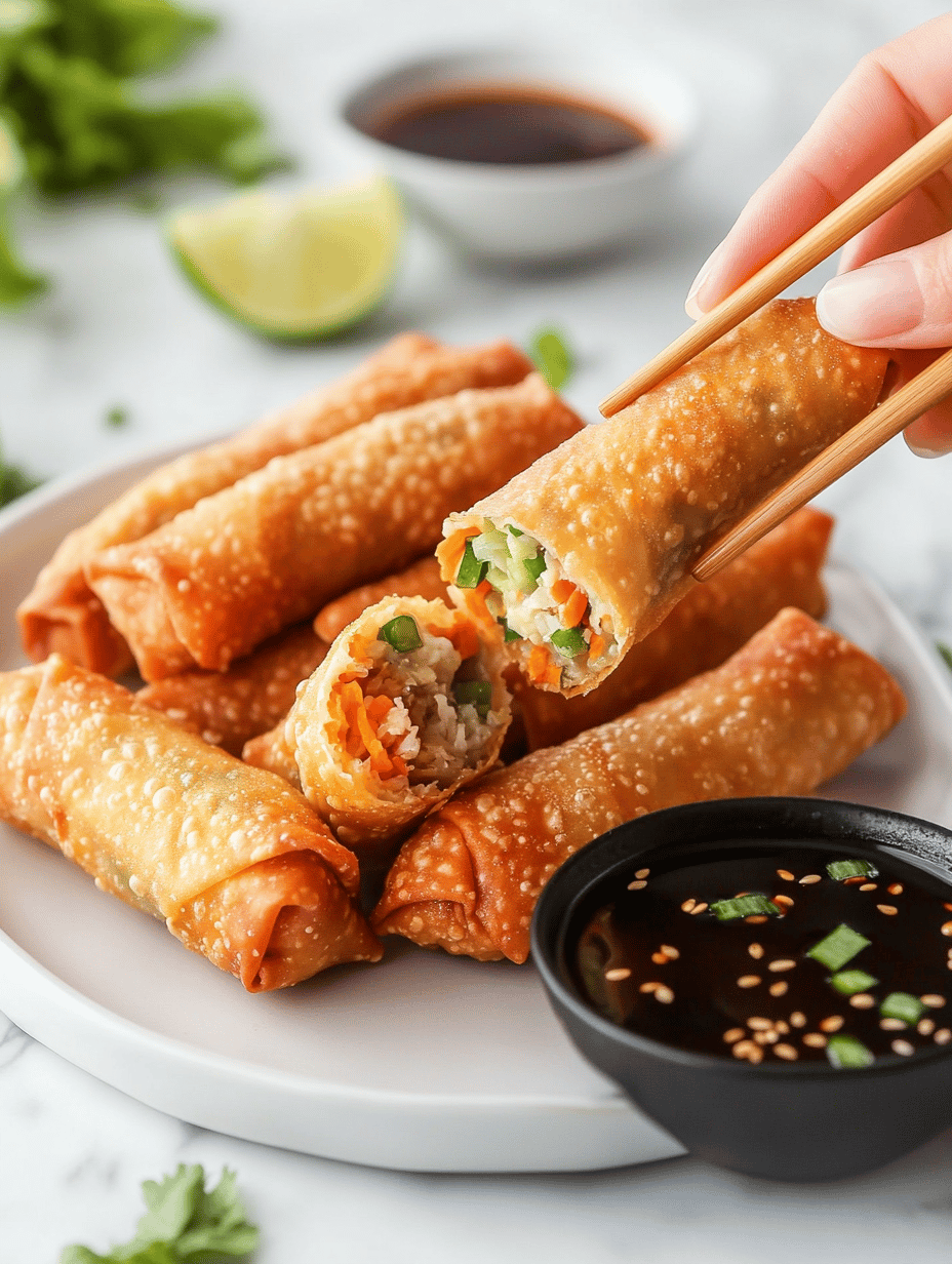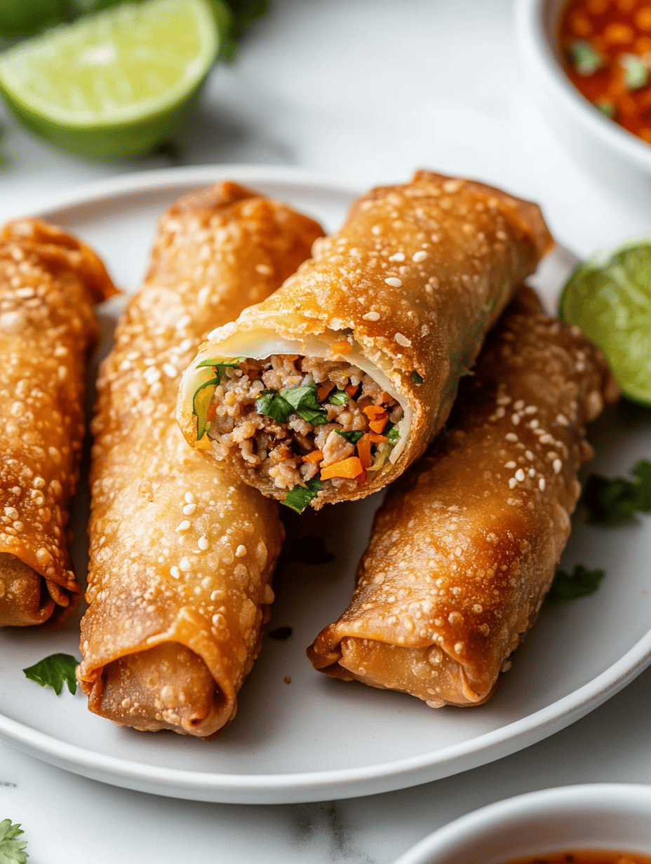 Delicious homemade egg rolls filled with savory, juicy ingredients and wrapped in a crispy shell.