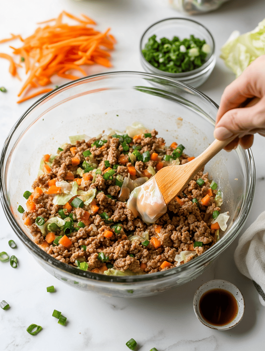 Combine shredded cabbage, shredded carrots, and shredded cooked pork or chicken in a mixing bowl.