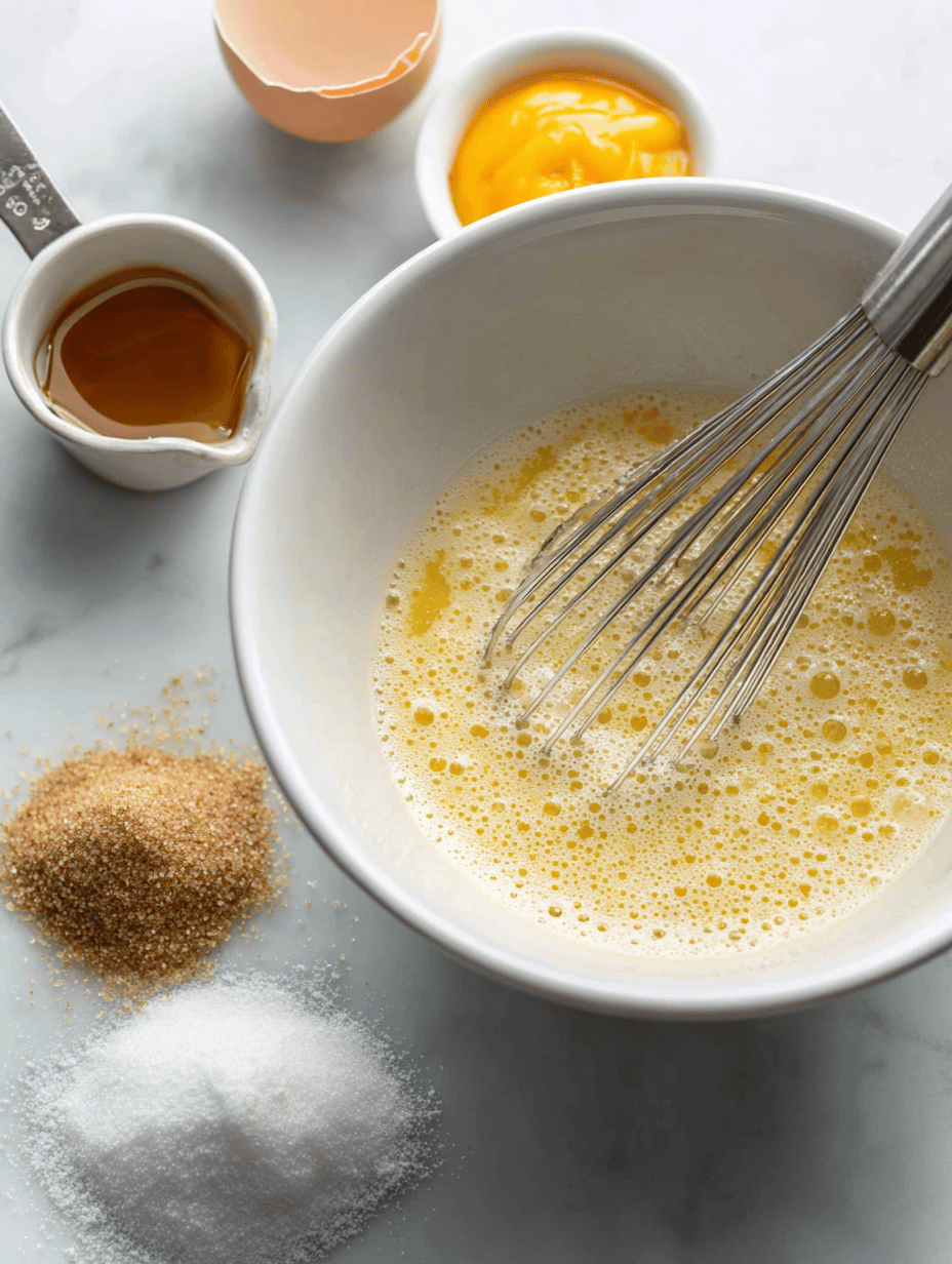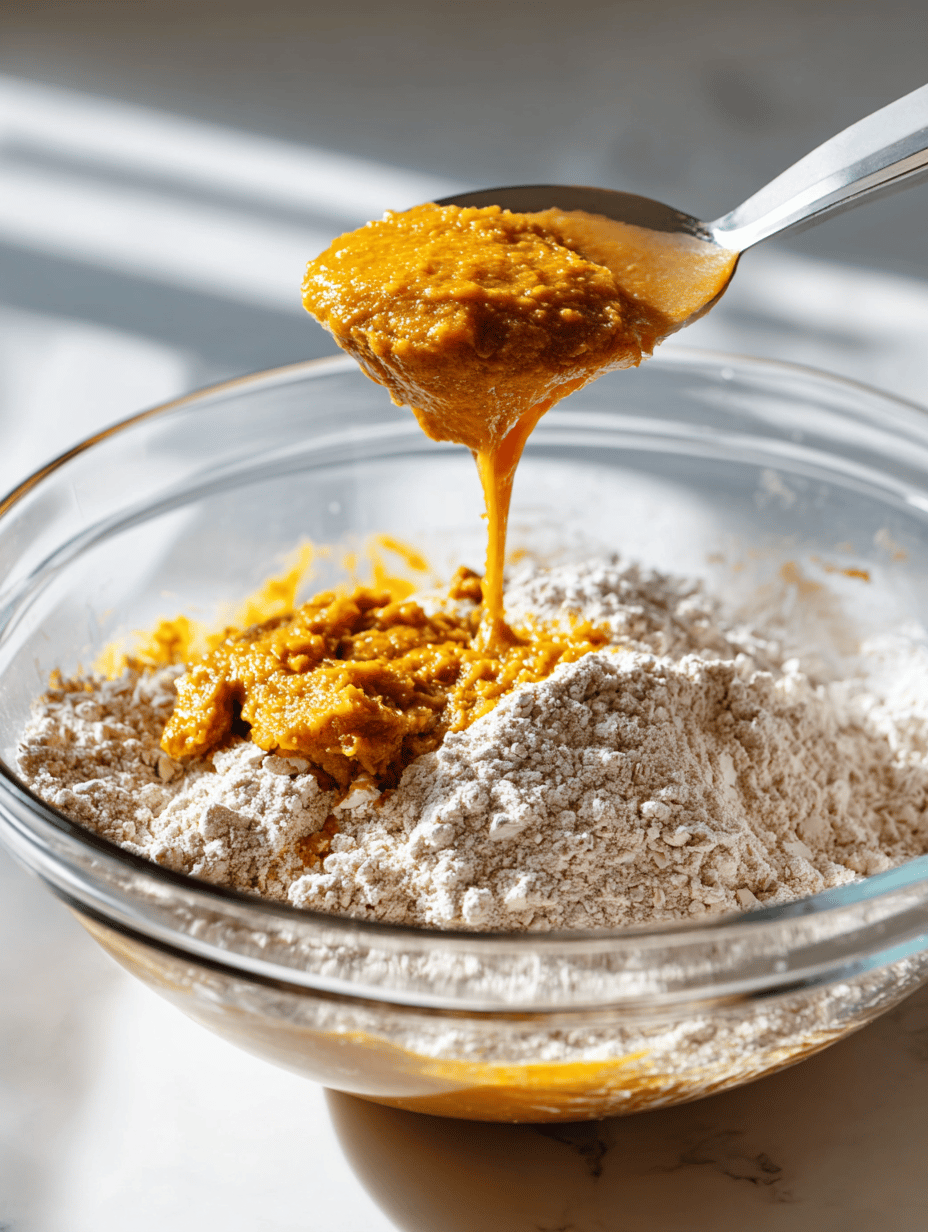 In a separate bowl, beat the eggs until they’re slightly frothy, then add the granulated sugar, brown sugar, oil, and pumpkin puree. Mix until smooth and fragrant, about 2 minutes.