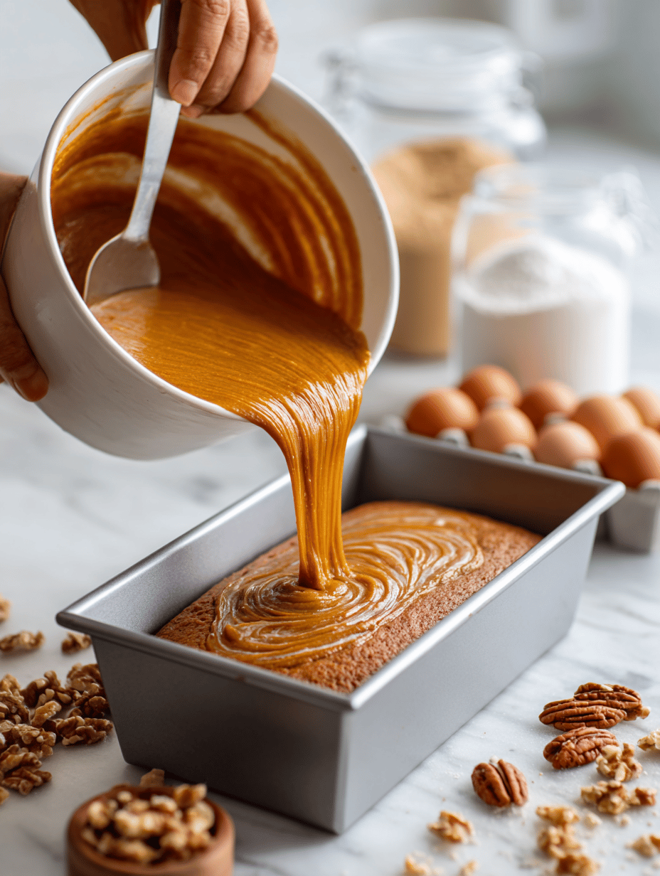 Pour the batter into your prepared loaf pan, smoothing the top with a spatula so it’s even. This helps create a uniform loaf with a nice crust.