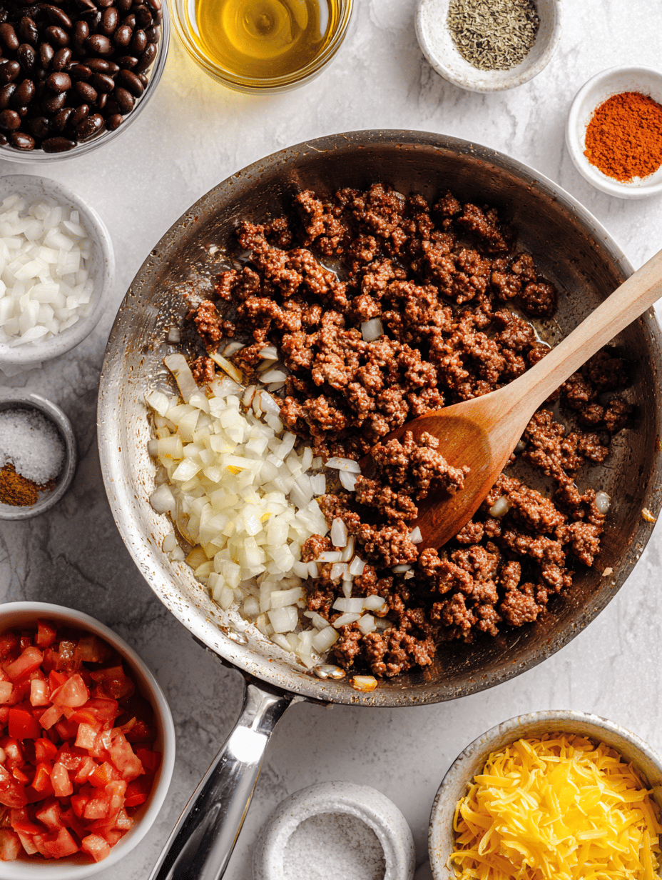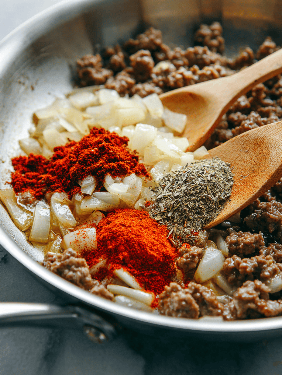 Sprinkle in the chili powder, cumin, and smoked paprika. Stir well to coat the meat and vegetables, then cook for 1-2 minutes until the spices are fragrant and slightly darker in color, unlocking their full aroma.