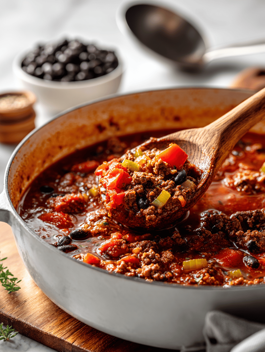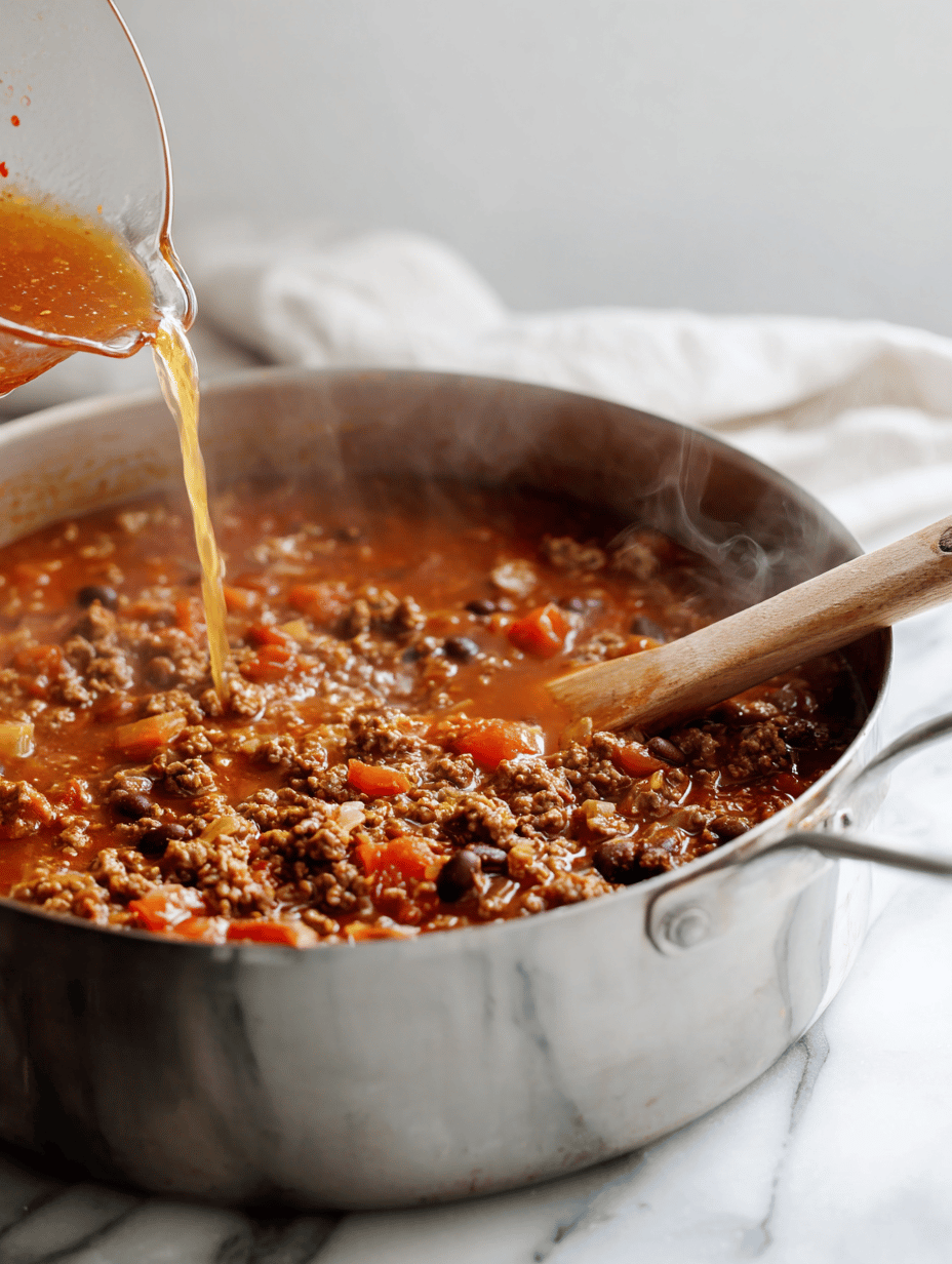 Pour in the chopped tomatoes and beef broth, scraping the bottom of the pot to loosen any browned bits. Bring the mixture to a gentle simmer, then lower the heat to low, cover loosely, and simmer for 45 minutes, stirring occasionally, until the chili thickens and flavors meld.