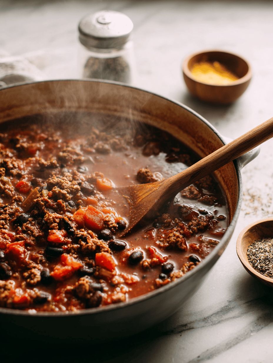 Check the seasoning and add salt, pepper, or more chili if you want extra heat. The chili should be thick, bubbling gently, with a smoky aroma and tender meat. When ready, taste and adjust the seasonings as needed.