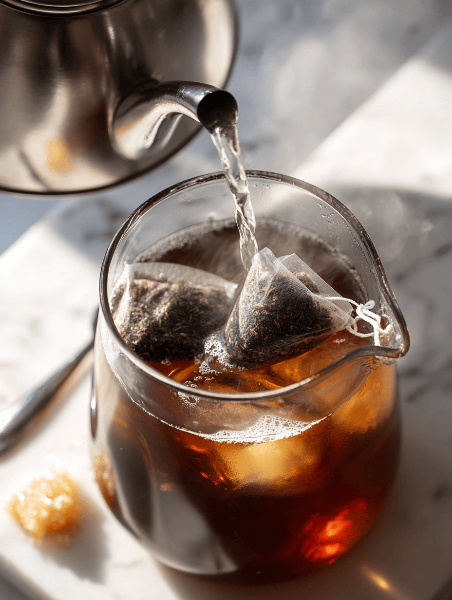 Place the black tea bags into a large pitcher, then pour hot water over them. Steep for 5 minutes until the tea is strong and fragrant, then remove the bags and stir in the sugar or honey until fully dissolved.