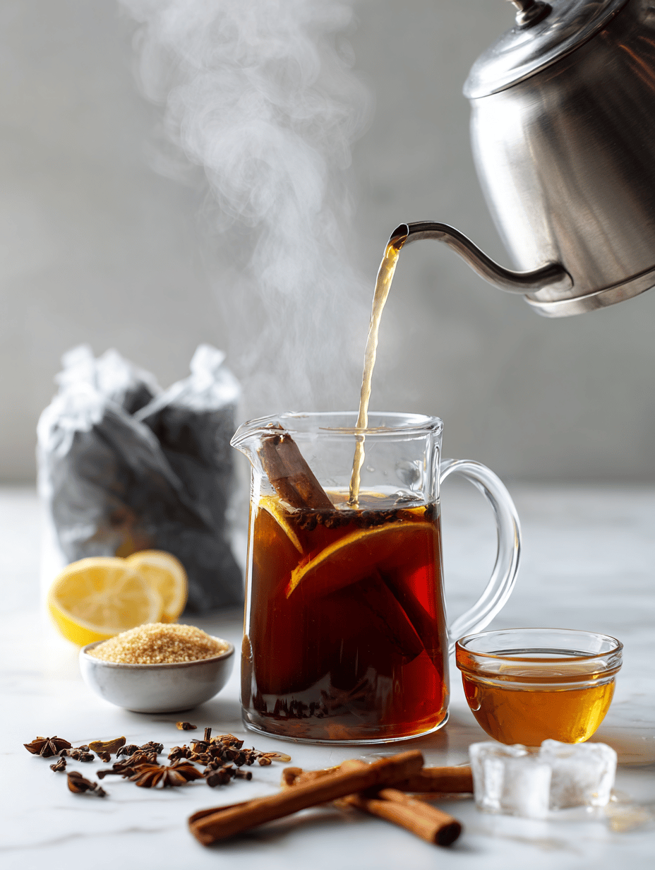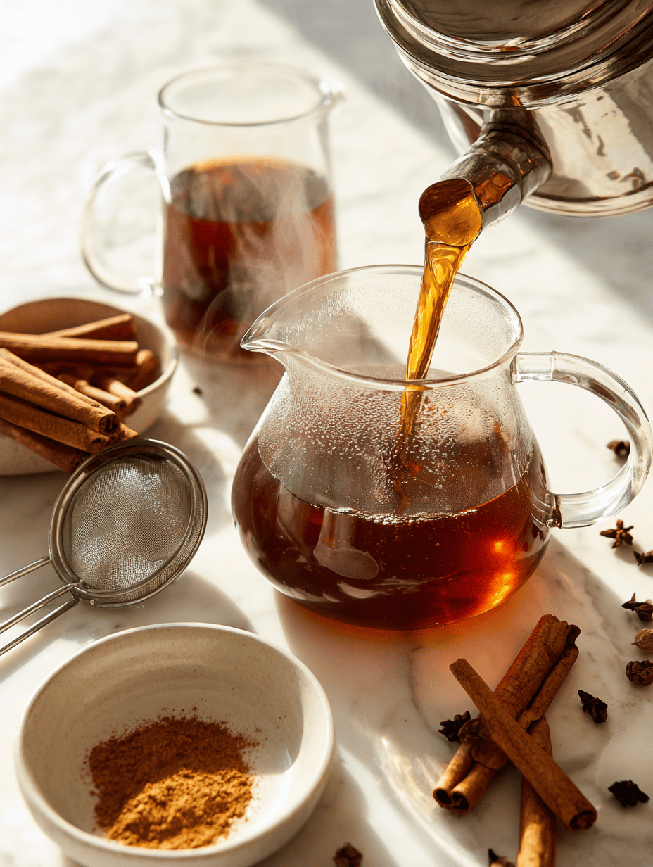 Add a pinch of cinnamon and cloves to the hot tea. Let the mixture steep for another 10 minutes to allow the spices to bloom, then strain out the spices or discard the whole ones if used.