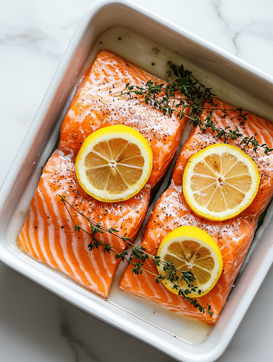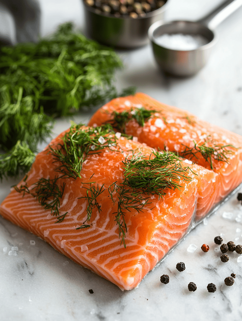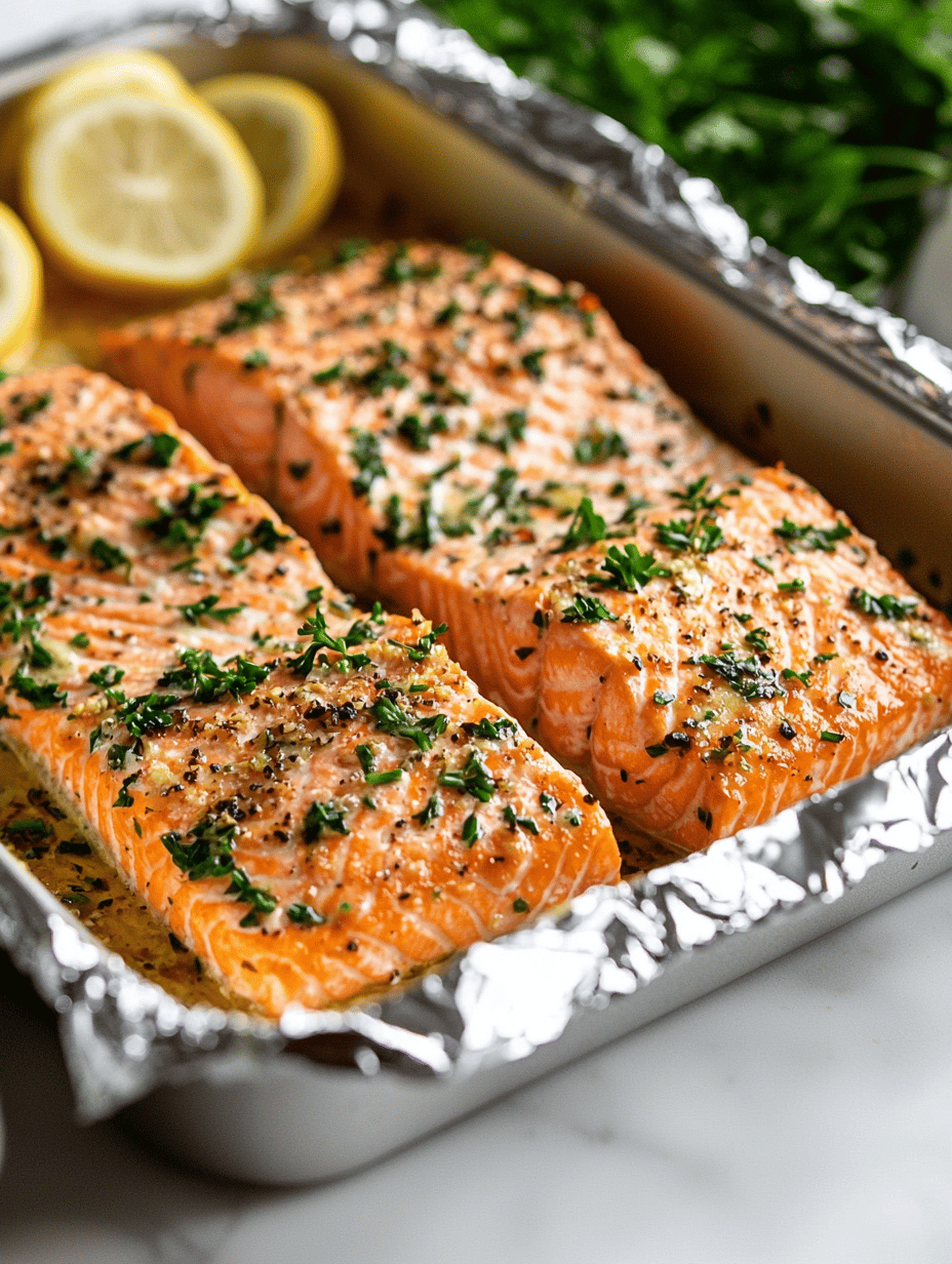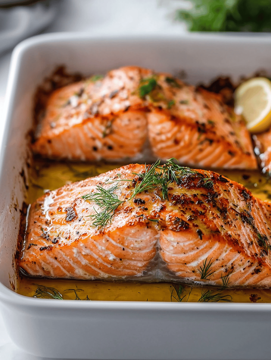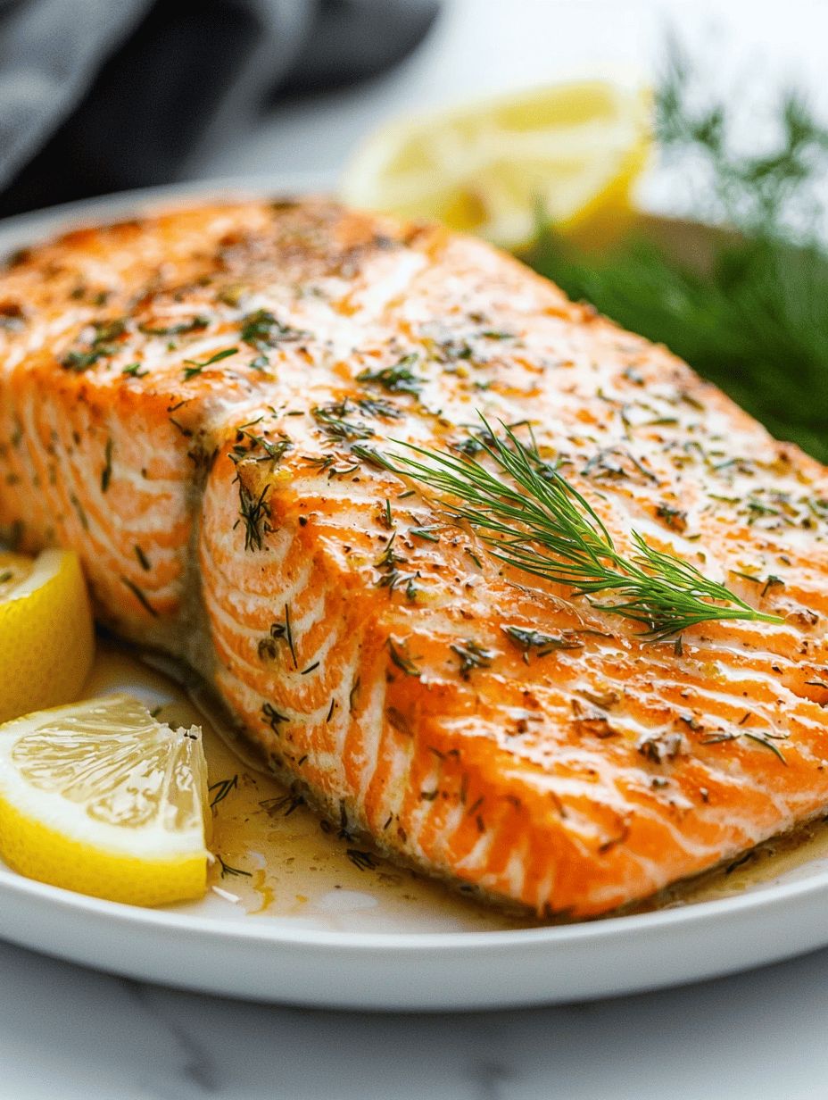 Irish Baked Salmon is a dish featuring tender, flaky salmon fillets baked with fresh dill and lemon slices. The salmon is seasoned and cooked until just done, resulting in a moist texture with a subtle herb and citrus aroma and a lightly crisped surface.