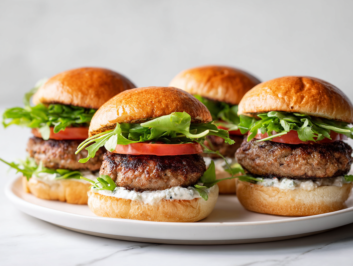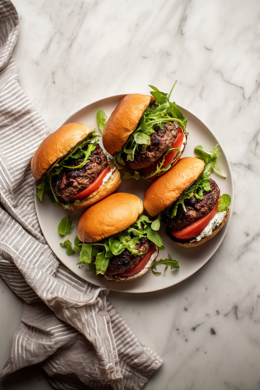 Assemble burgers with tomato slices, greens, and hot patties. Serve immediately.
