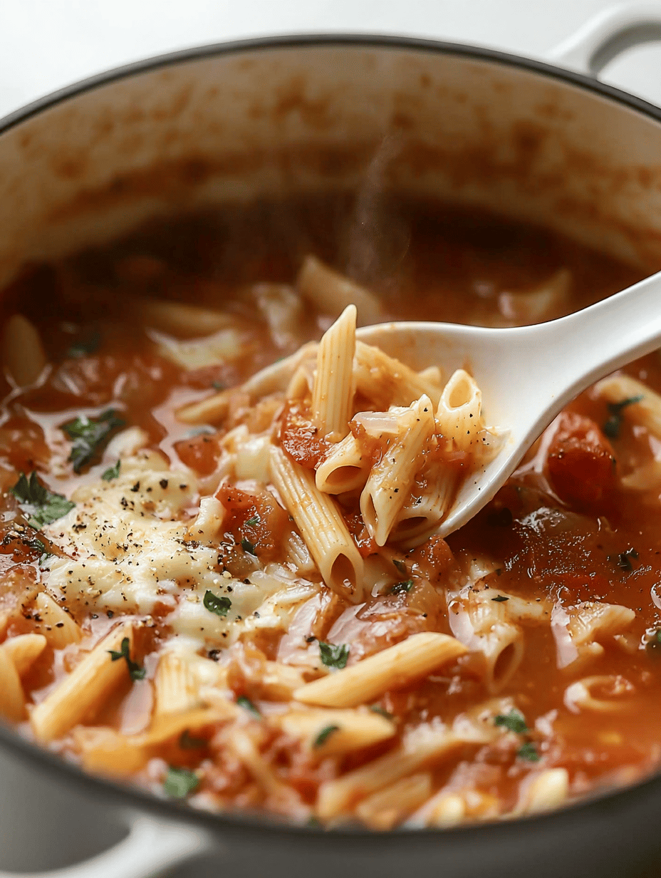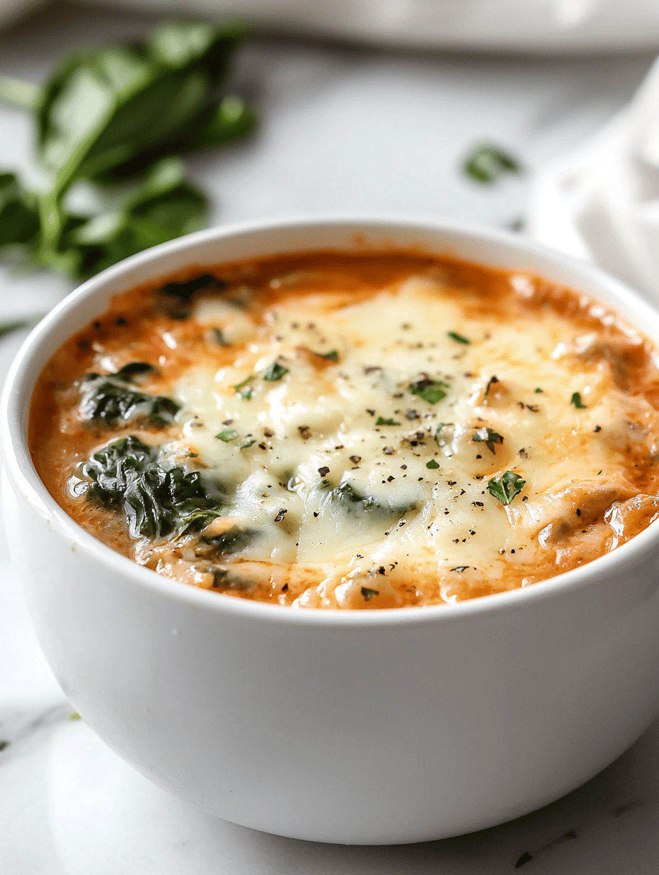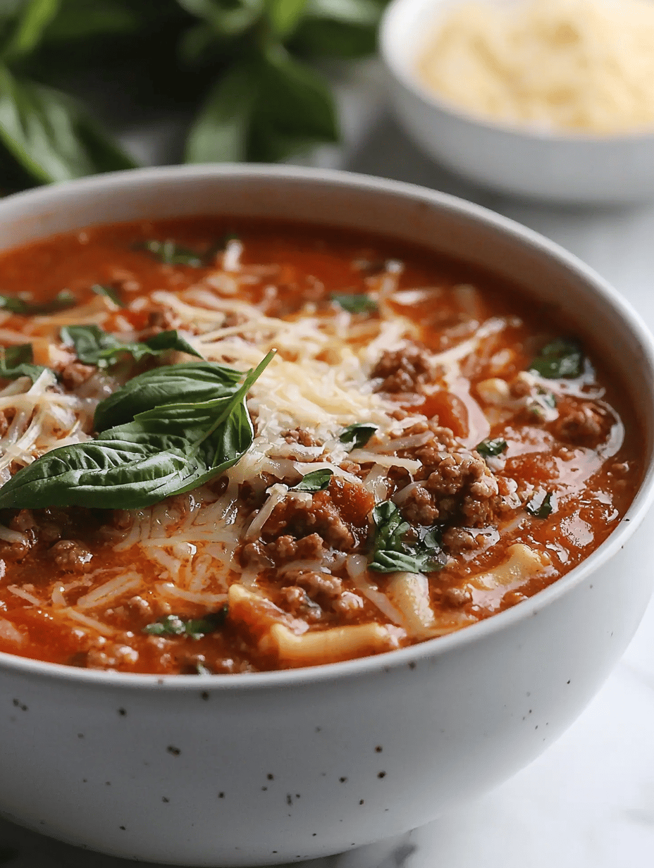 Serve the hot, cheesy lasagna-inspired soup in bowls, garnished with a sprinkle of additional Parmesan or fresh herbs if desired, for a cozy, comforting meal.