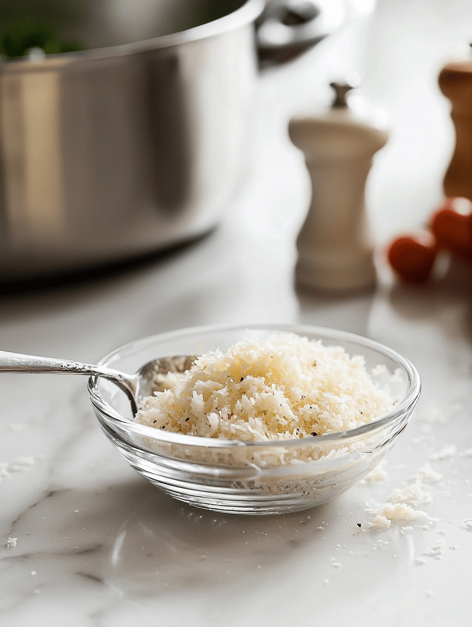 Lower the heat and add the shredded mozzarella and grated Parmesan cheeses, stirring continuously until the cheese melts smoothly into the broth, creating a creamy, cheesy layer.