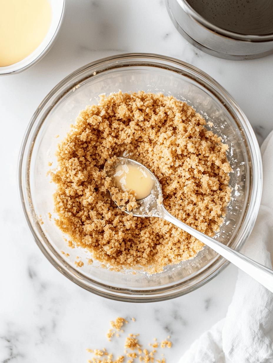 Mix graham cracker crumbs and 1/4 cup sugar in a bowl, then stir in melted butter until the mixture resembles coarse crumbs. Press this evenly into the base of your baking dish to form a firm crust. Bake at 350°F (175°C) for 10 minutes until lightly golden, then let it cool completely.