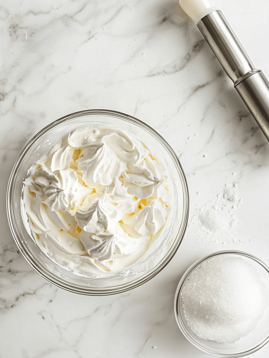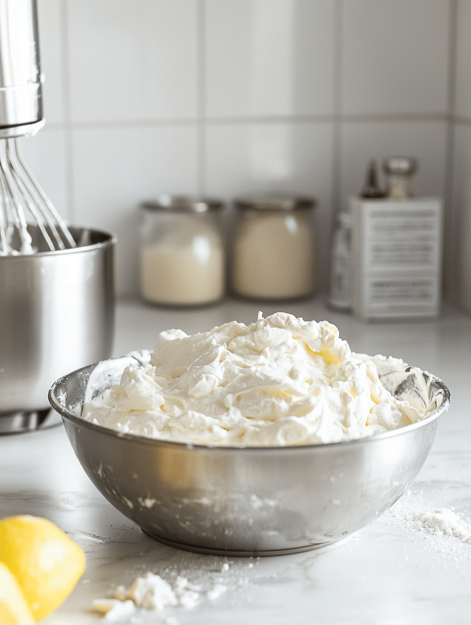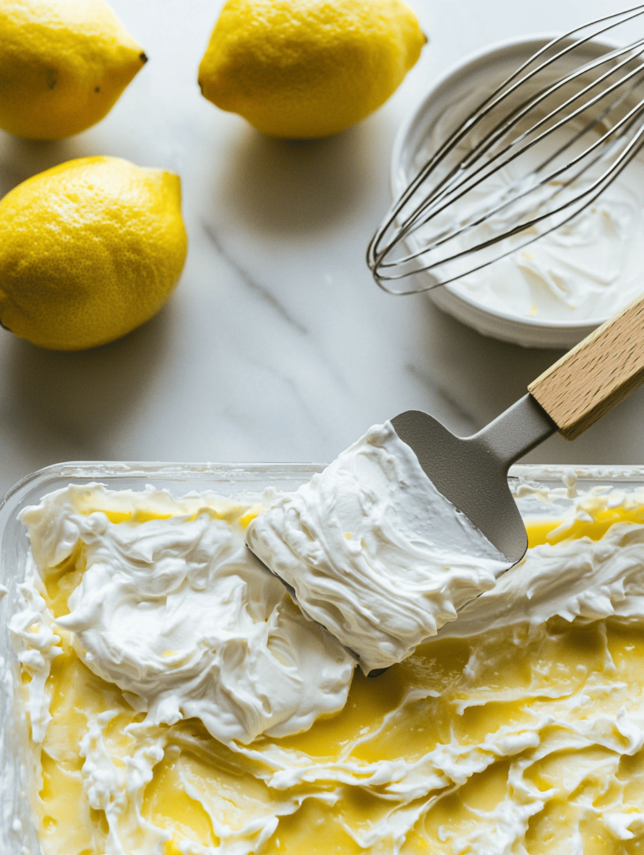Once the lemon curd has set, spread the sweetened whipped cream evenly over the lemon layer, smoothing it with a spatula. Chill again for at least 30 minutes to set the topping.