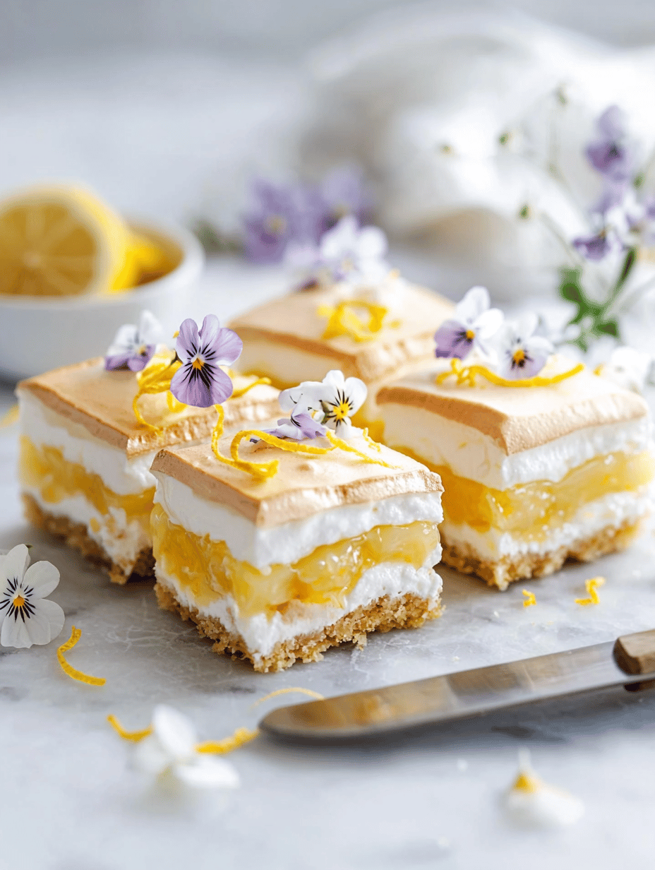 Let the dessert rest for a few minutes, then slice into squares and serve immediately to enjoy the crispy meringue, tart lemon filling, and crumbly crust together. Garnish with lemon zest or edible flowers for a beautiful finishing touch.
