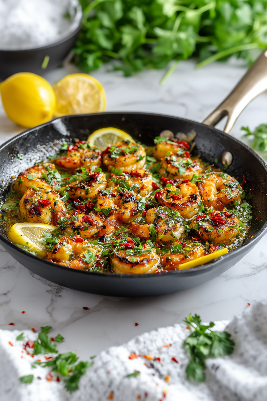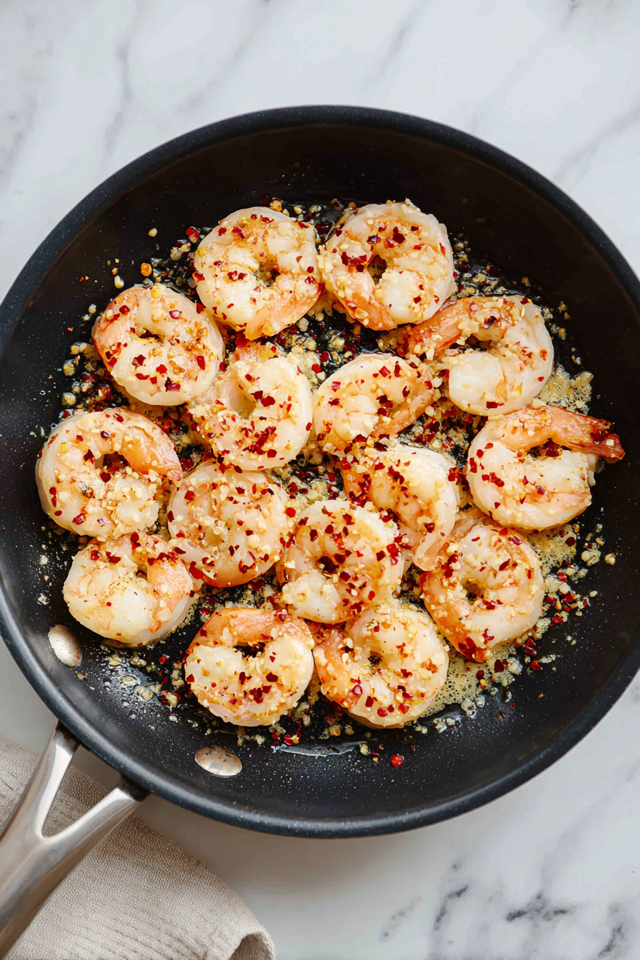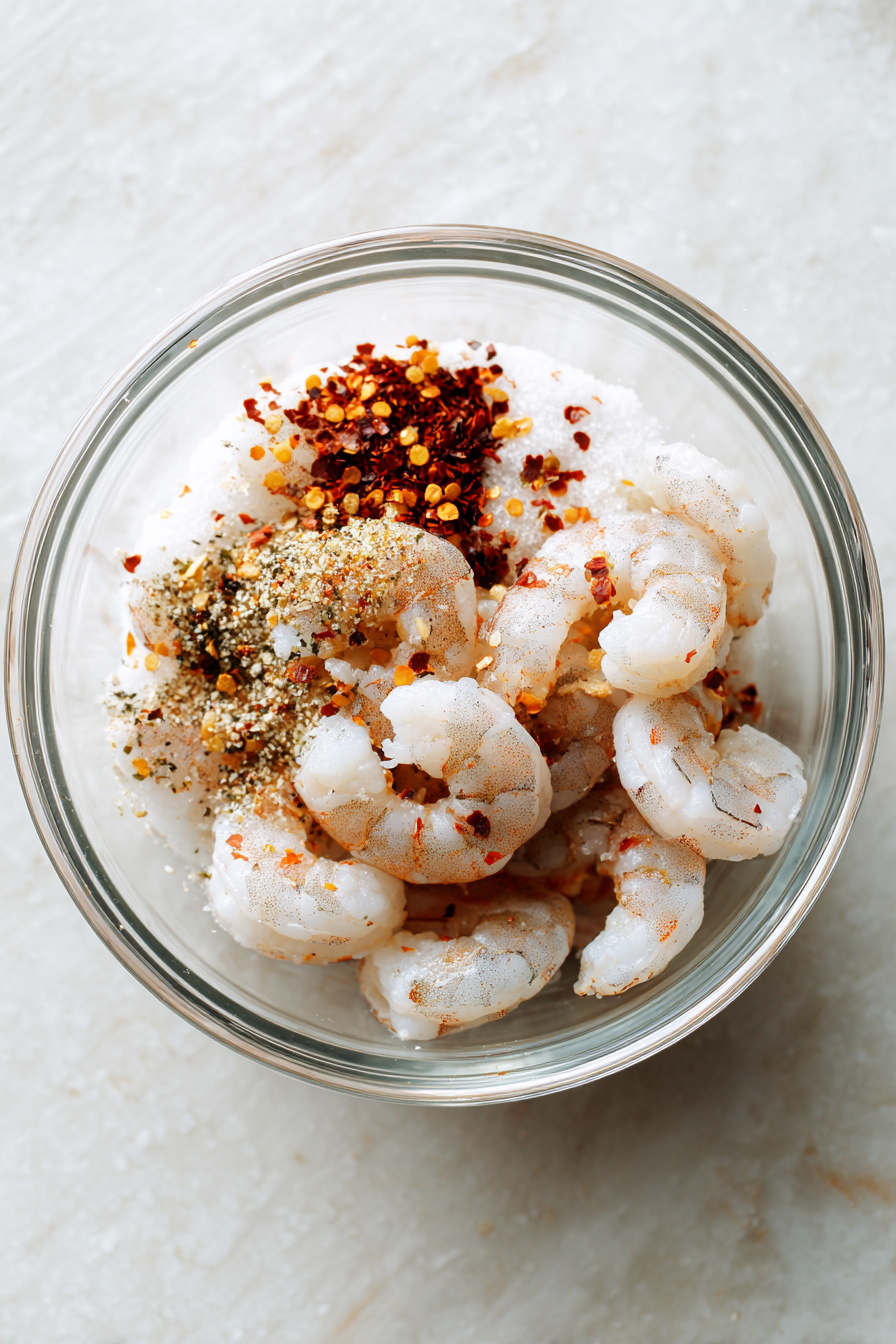 In a large bowl, season shrimp with salt, pepper, paprika, onion powder, and chili flakes.