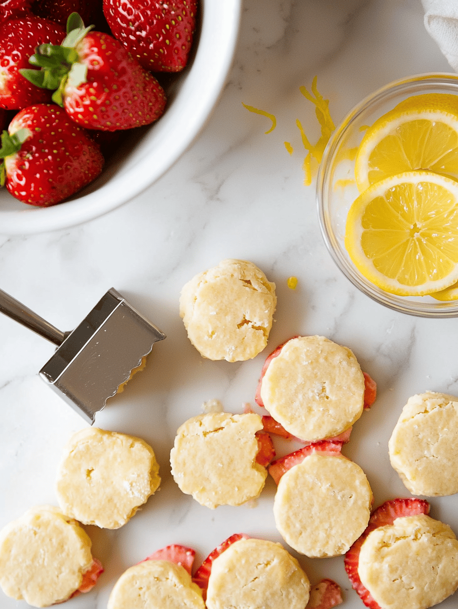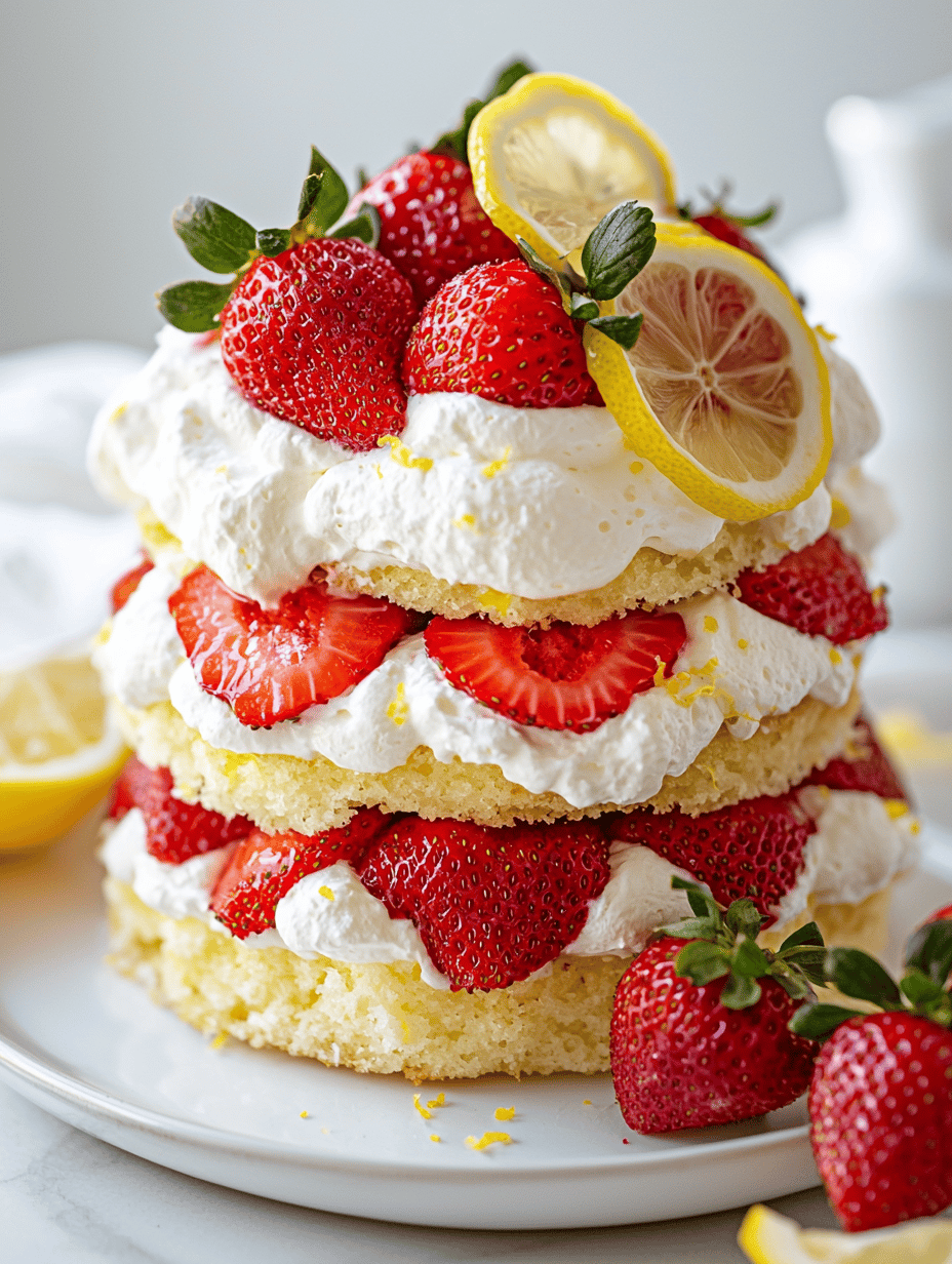 This strawberry shortcake features tender, buttery biscuits infused with lemon zest and juice, layered with fresh strawberries that are lightly macerated with citrus. The dessert is finished with whipped cream, creating a light, airy texture and a vibrant, citrus-berry flavor profile. The final presentation showcases golden-brown shortcakes topped with bright, juicy fruit and fluffy cream.