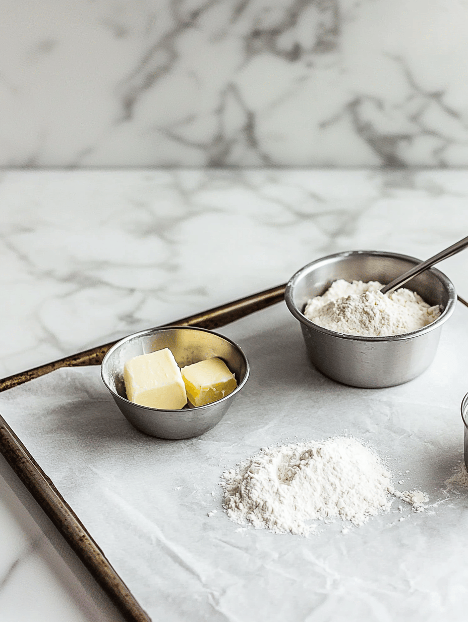 Add the cold butter pieces to the flour mixture. Use a pastry cutter or fork to cut the butter into the dry ingredients until the mixture resembles coarse crumbs with some pea-sized pieces.