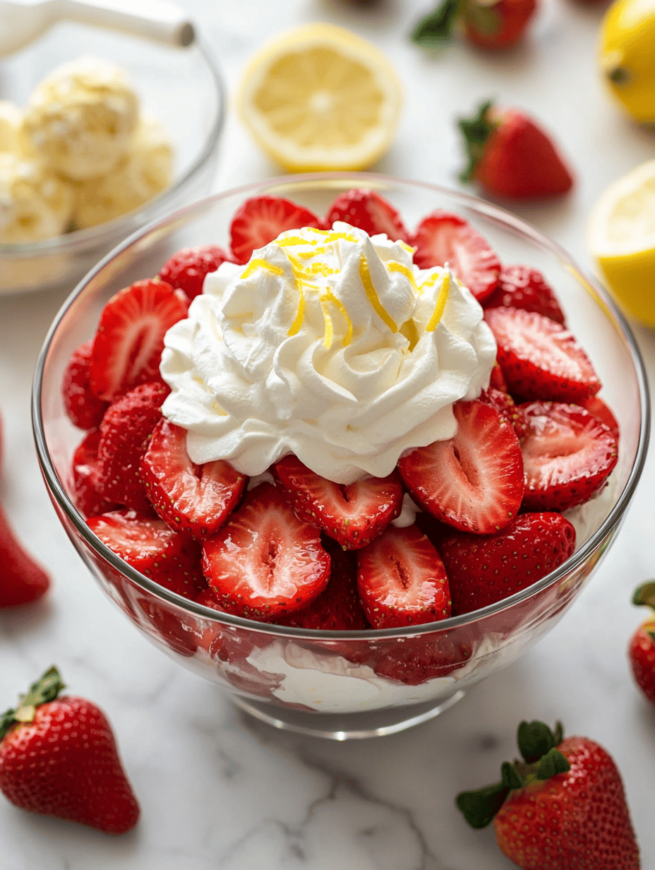 Ensure to chill the cream well before whipping for best results. Adjust sweetness of strawberries to taste. Lemon zest and juice add a brightness that elevates the flavor profile. Use fresh, ripe strawberries for maximum sweetness.