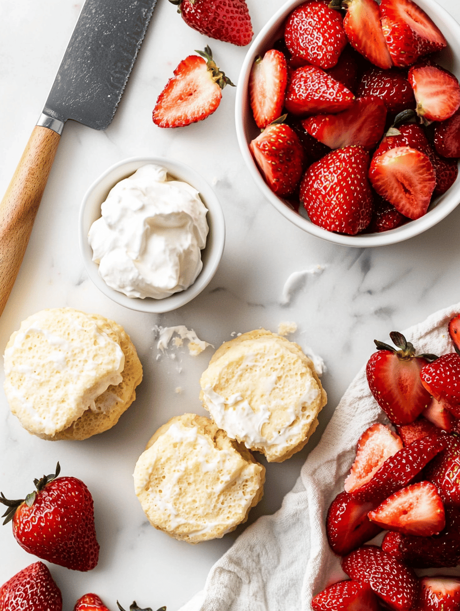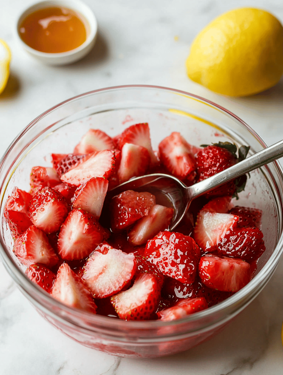 While the shortcakes are baking, prepare the strawberries. In a bowl, toss the sliced strawberries with honey or sugar and let them macerate for about 10 minutes until they release their juices.