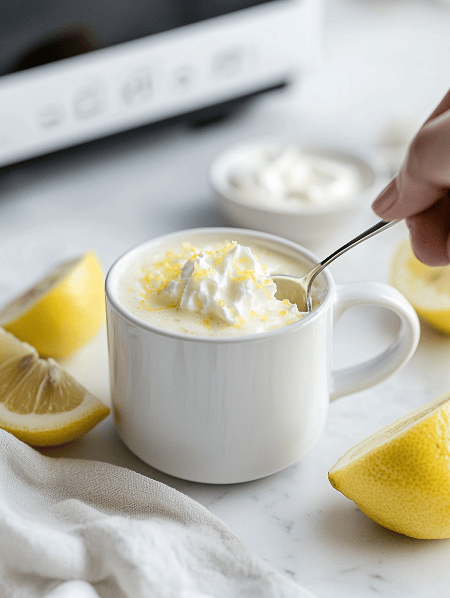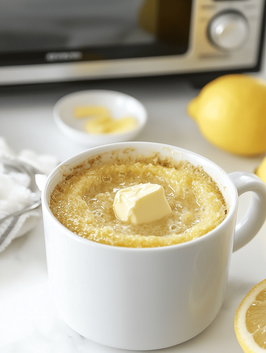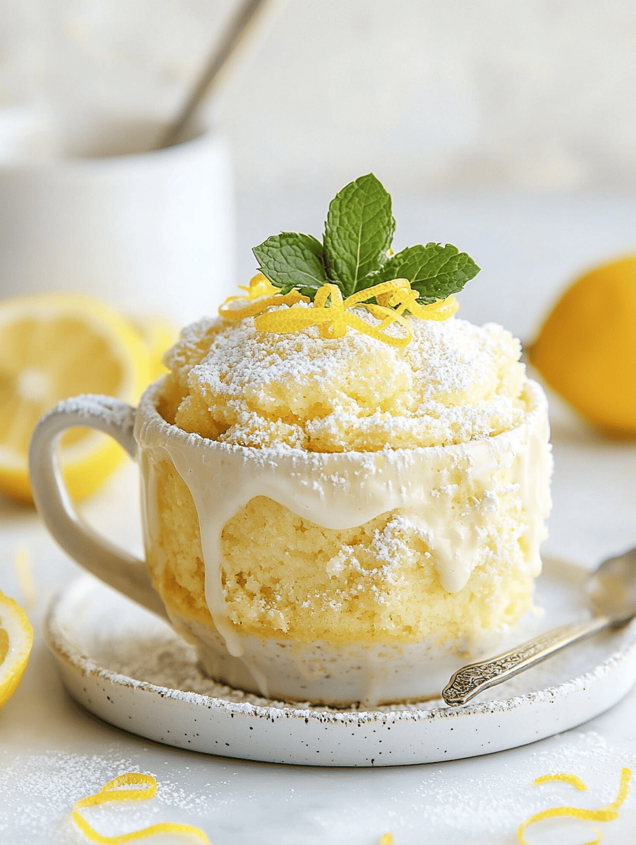 Let the mug cake cool for a minute or two, then enjoy it straight from the mug or turn it out onto a plate. The cake should be soft, fluffy, and fragrant with lemon.