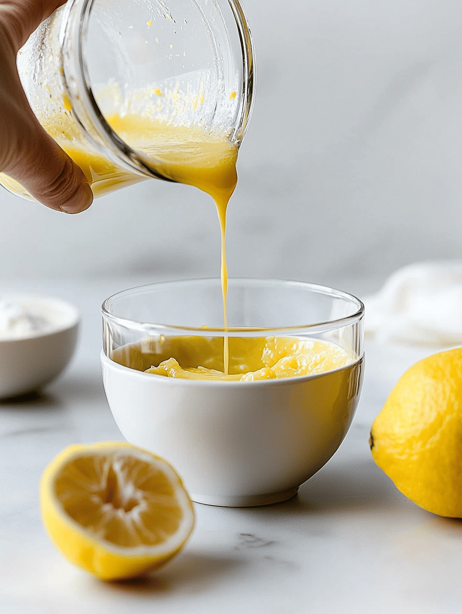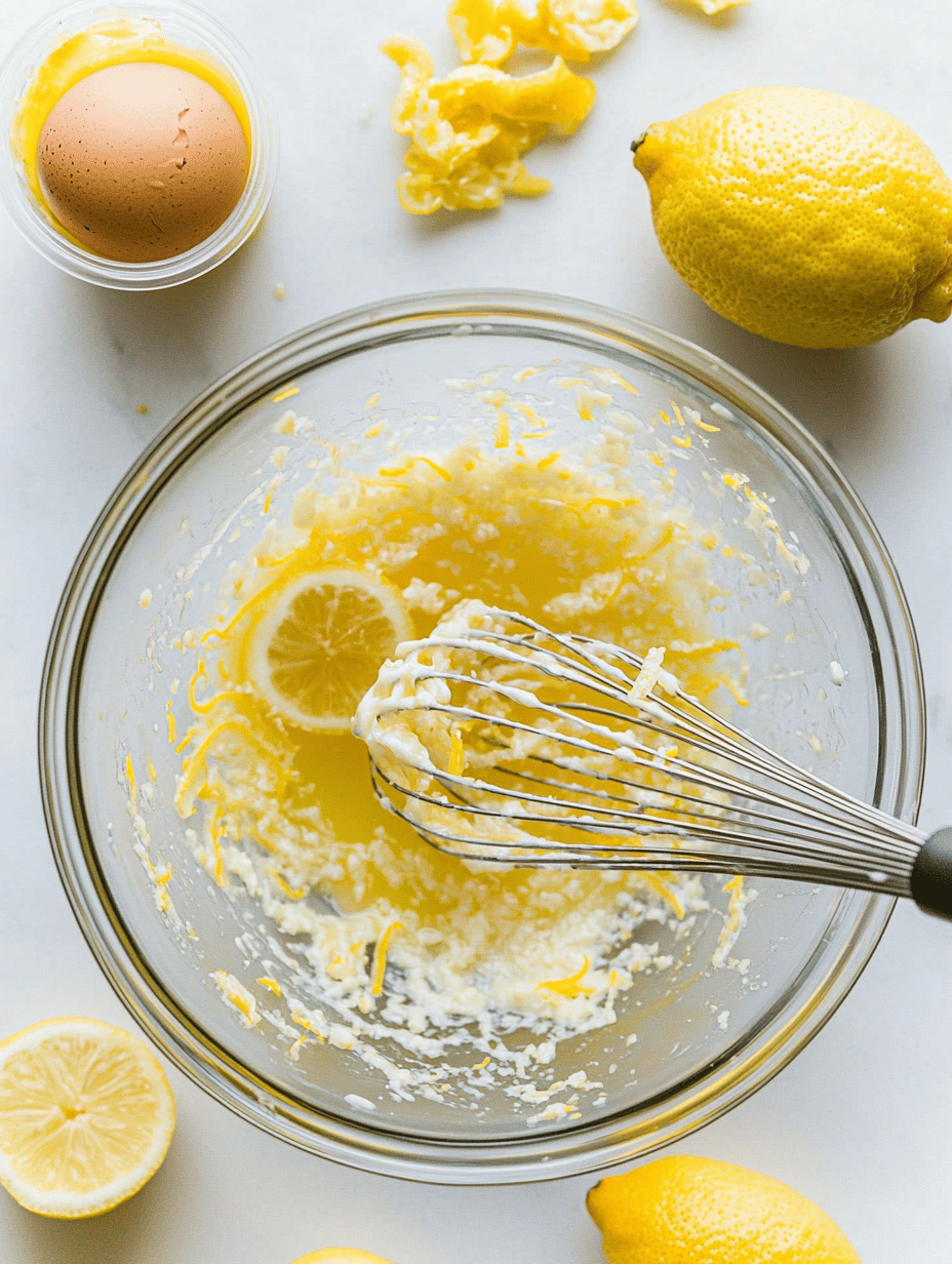 Add the lemon zest, lemon juice, vegetable oil, and egg to the dry ingredients. Whisk until the batter is smooth and slightly frothy, with no lumps remaining.