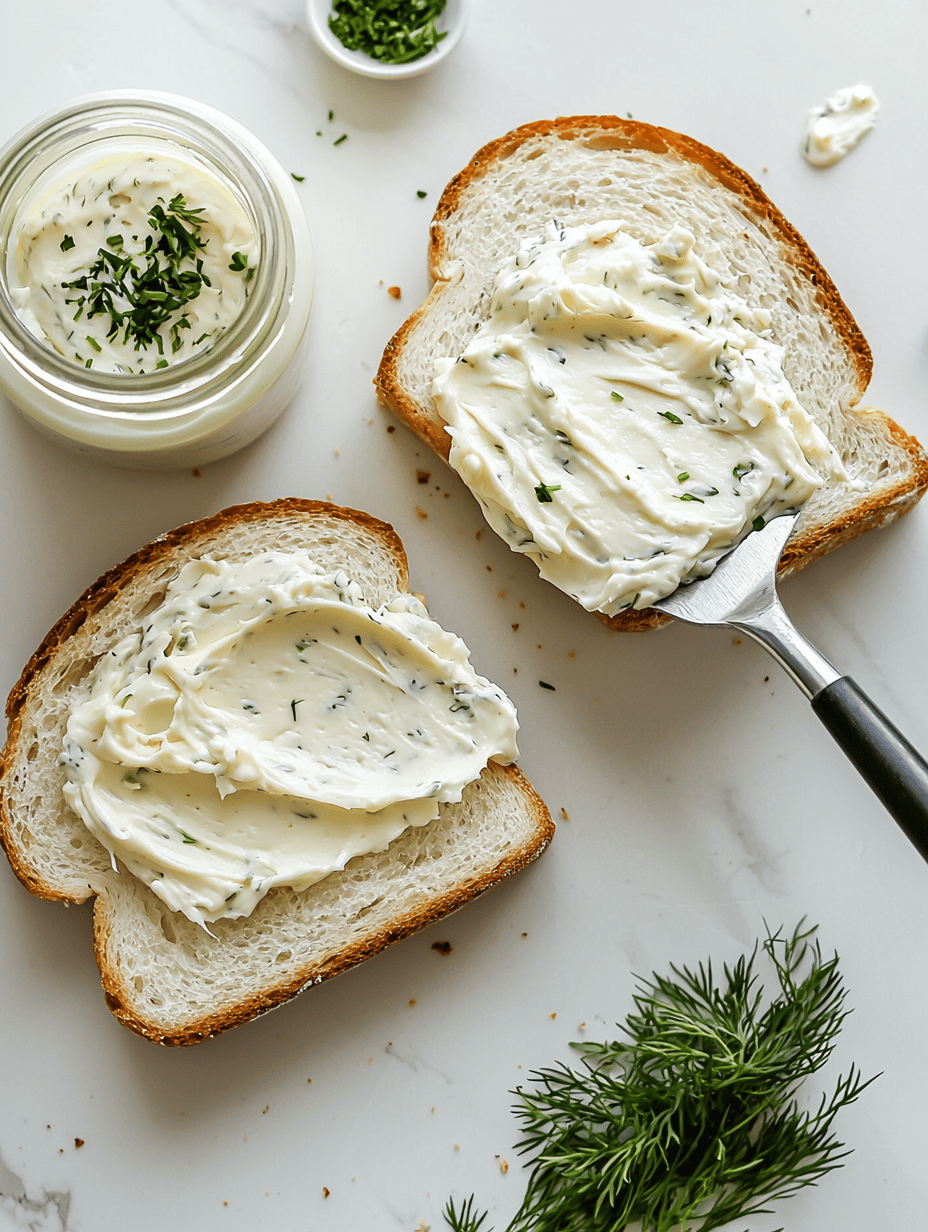 Spread the herbed cream cheese evenly over the slices of bread using a small spatula or butter knife, covering the surface completely for a smooth layer.