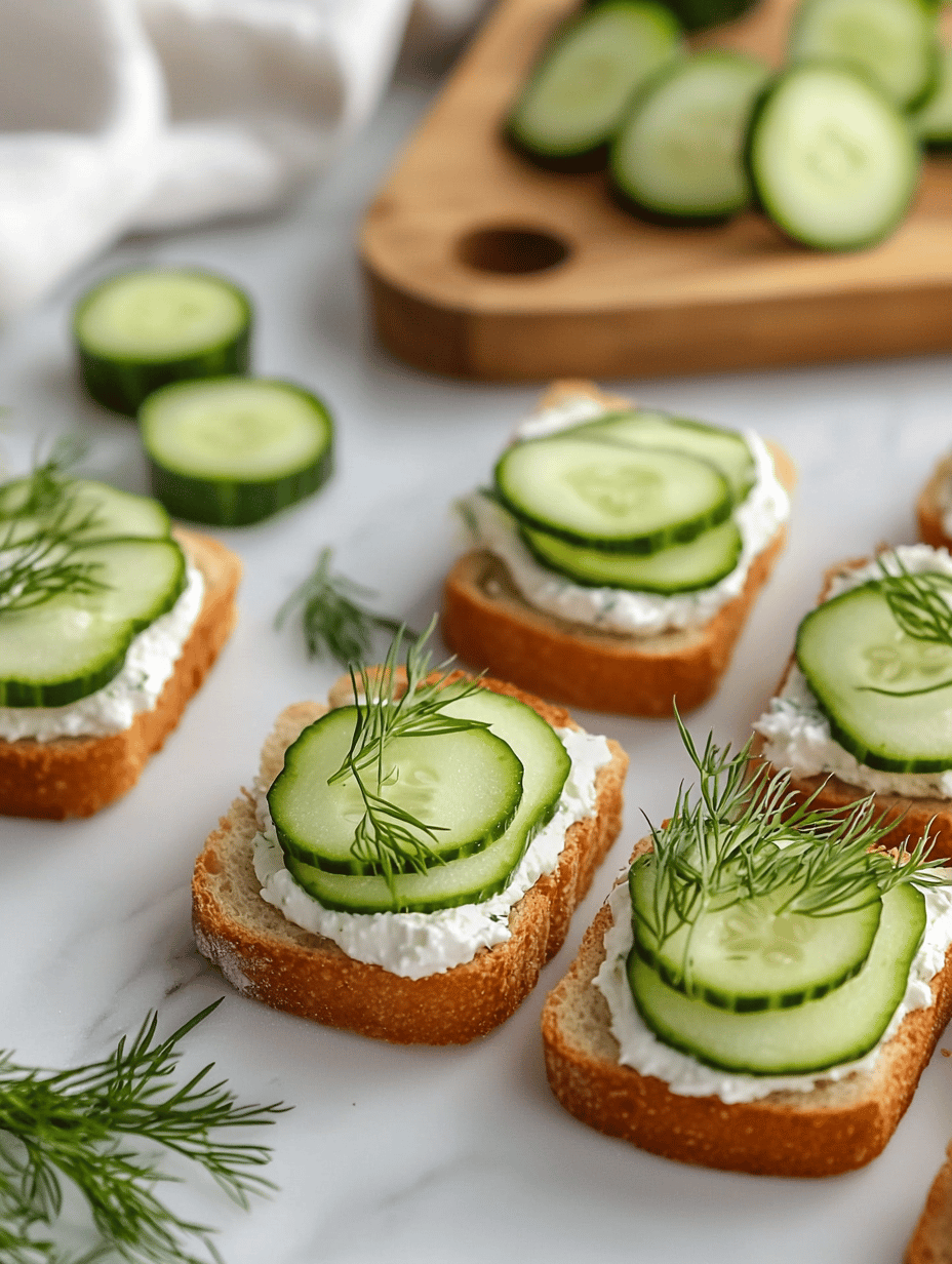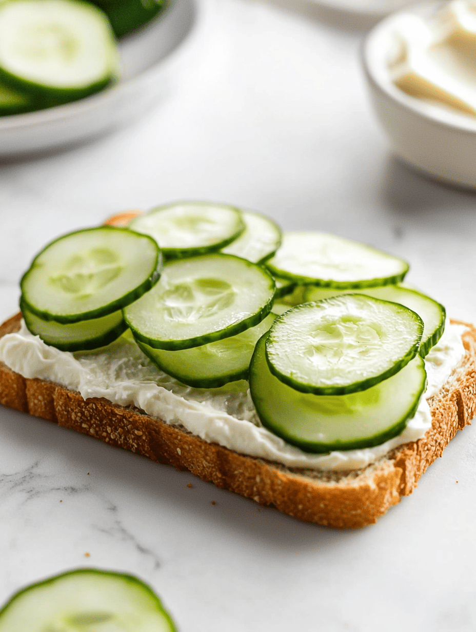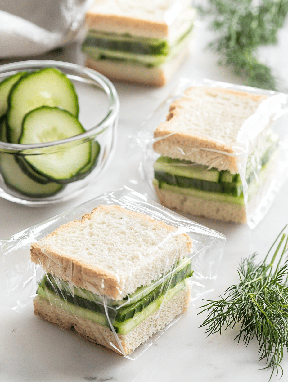Arrange the cut sandwiches on a platter, optionally garnished with additional cucumber slices or herbs for a beautiful presentation.
