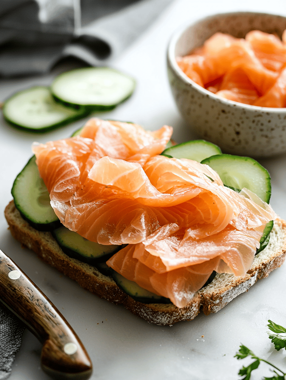 Lay the slices of smoked salmon over the cucumber, distributing them evenly for a delicate, flavor-packed layer.