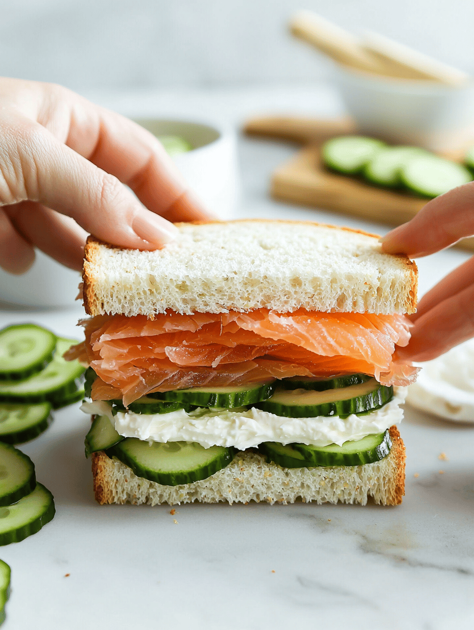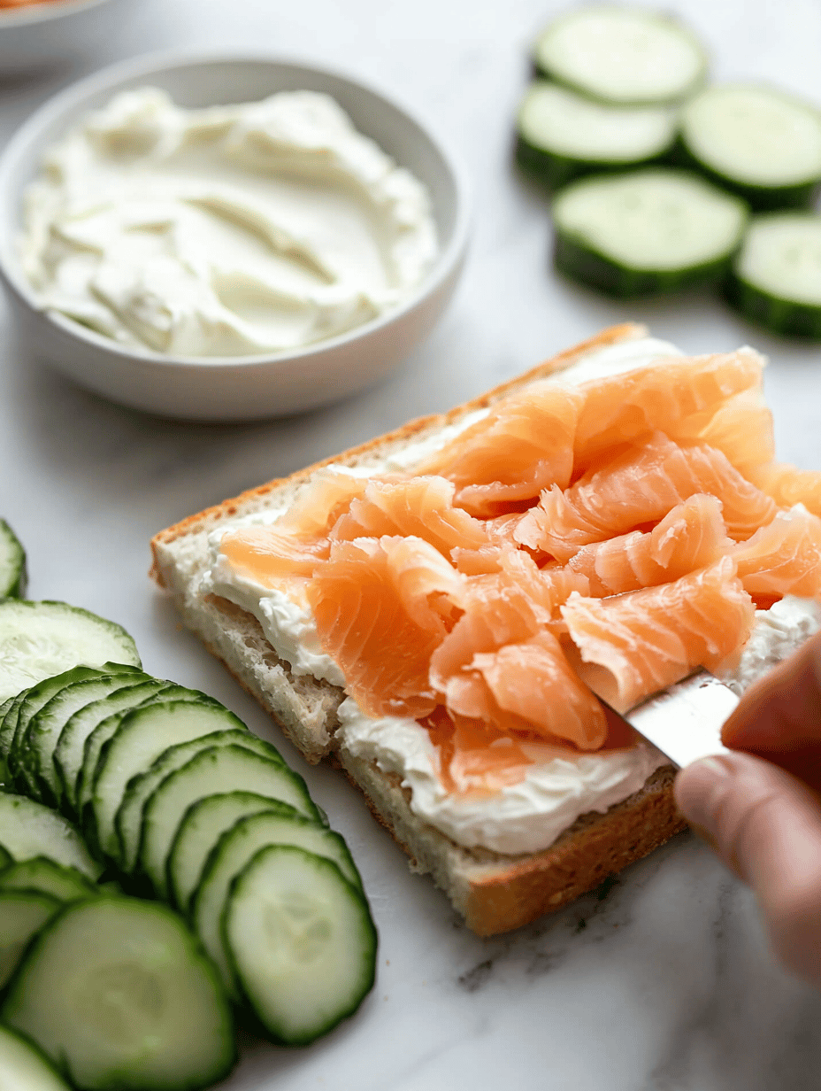 Repeat the spreading of cream cheese, layering of cucumber and salmon, then top with the final bread slice to complete the sandwich.