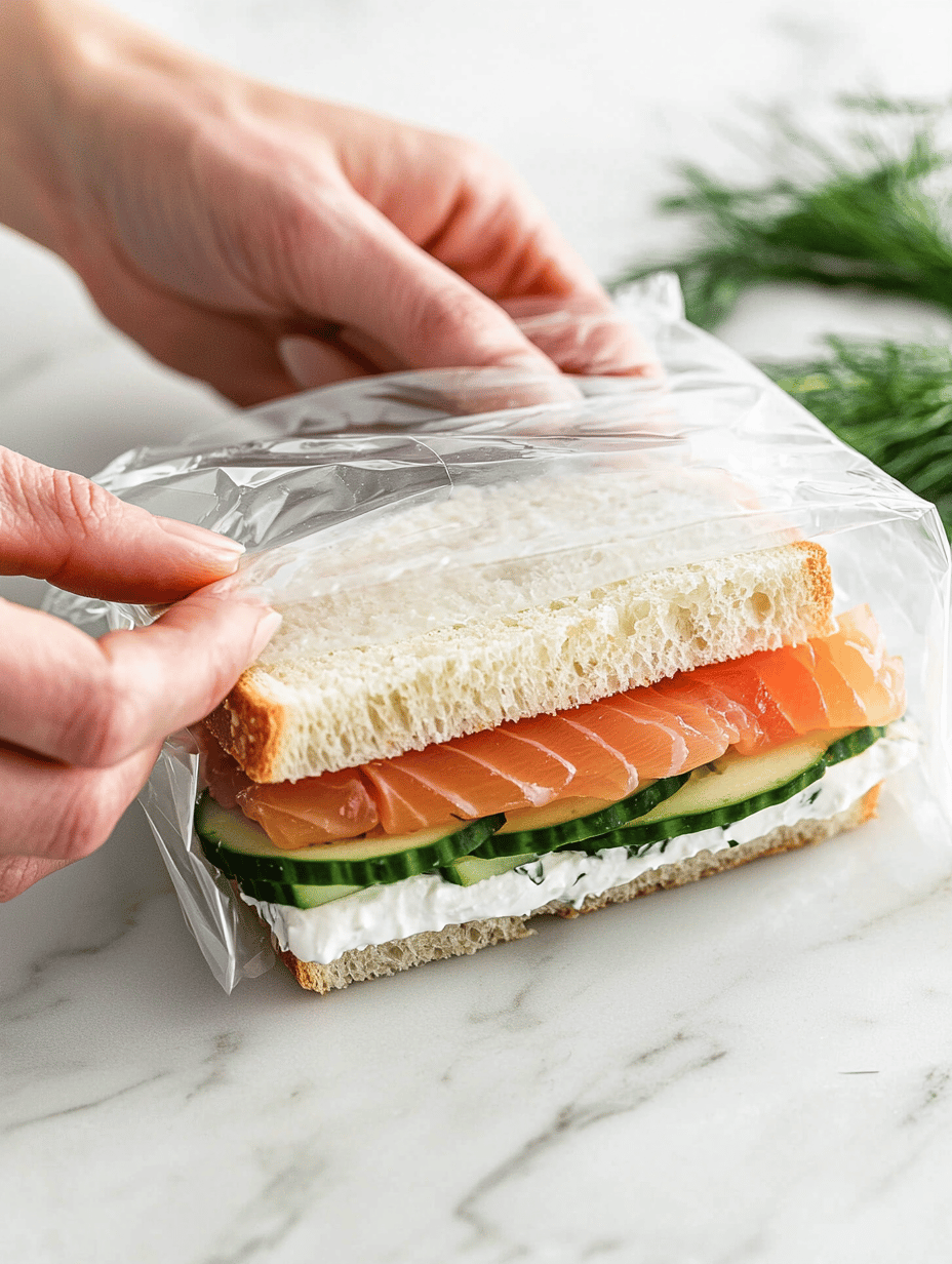 Wrap the assembled sandwich tightly with plastic wrap, ensuring all sides are covered to maintain freshness and prevent sogginess.