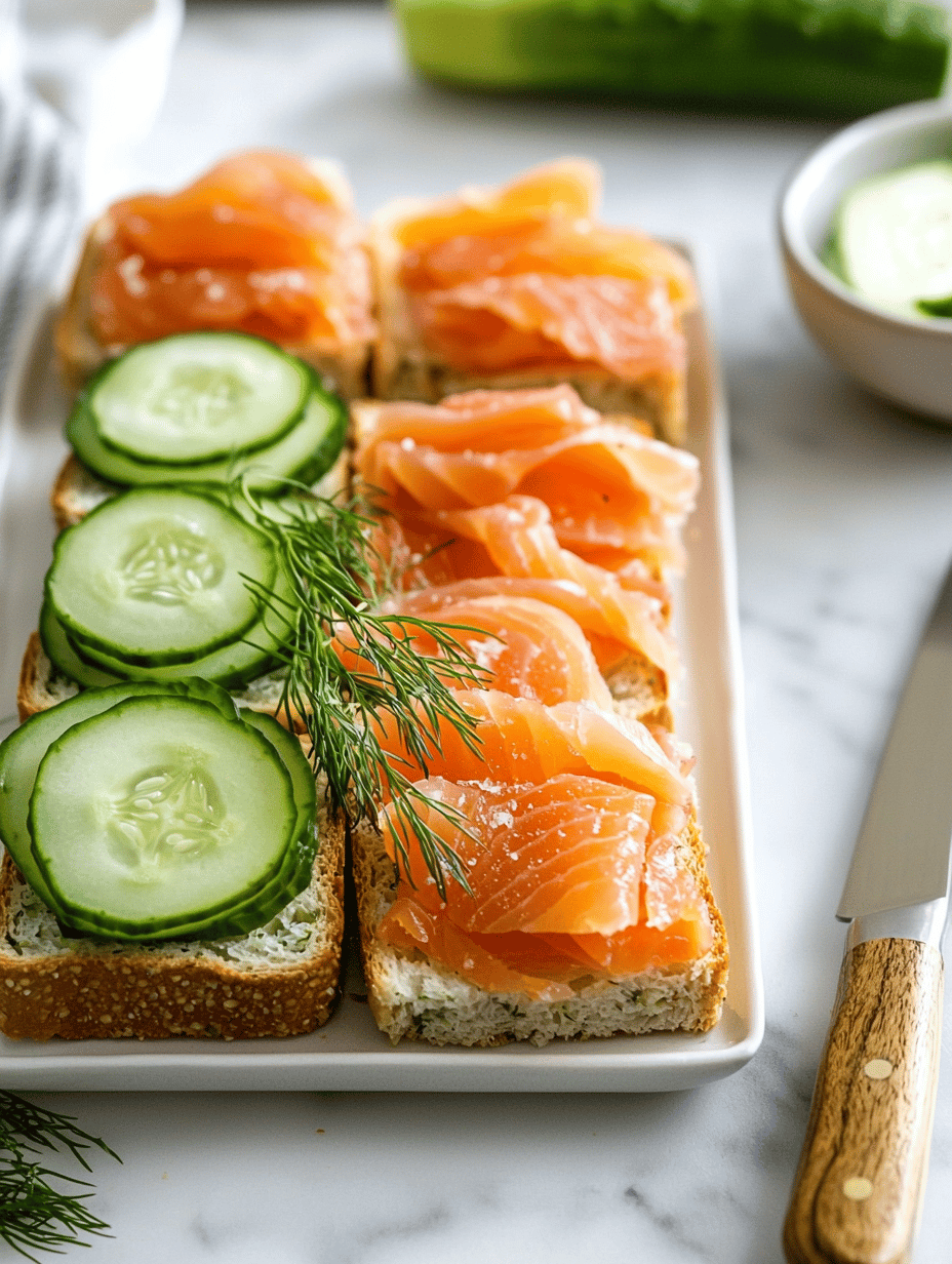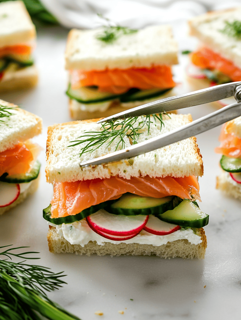 These make-ahead tea sandwiches feature layerings of flavorful ingredients such as herbed cream cheese, cucumber, and smoked salmon on soft bread. They are assembled in advance and kept chilled, resulting in tender, well-flavored bites with a delicate, elegant appearance. The sandwiches maintain freshness and texture when properly covered and refrigerated overnight.
