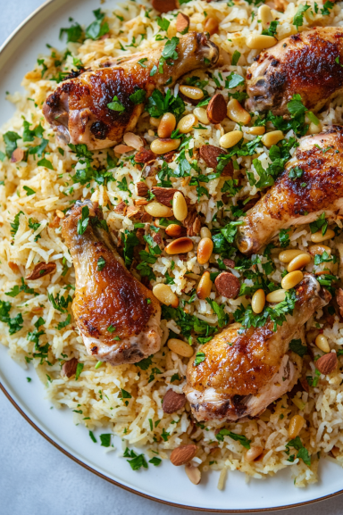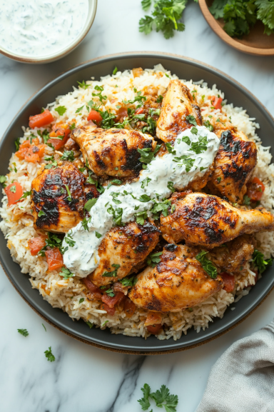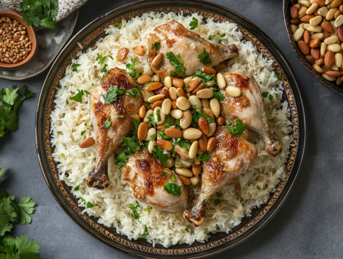 Assemble the Dish: Mound the cooked rice on a large platter, arrange the chicken on top, and pour most of the sauce over the dish.