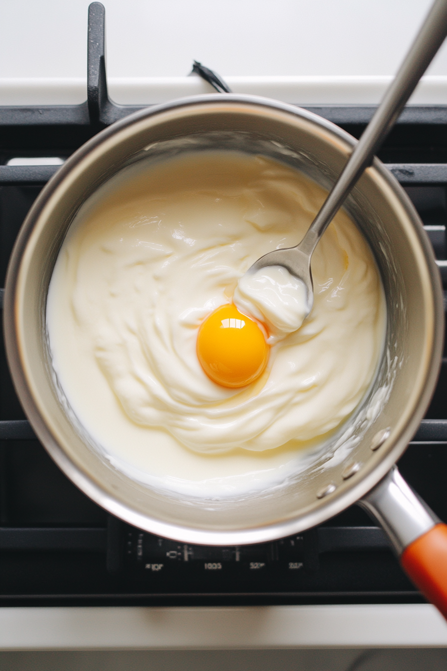 Prepare Yogurt Sauce: In a saucepan, stir yogurt until smooth. Add a beaten egg and cook over medium heat, stirring constantly.